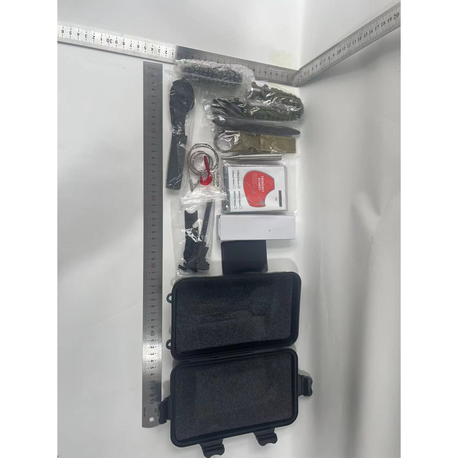 Kit supravietuire multifunctional 13 in 1 , Instrumente profesionale, agatatoare ghiozdan, pentru Camping, Drumetii, Aventuri in aer liber, borseta inclusa, model cutie, negru