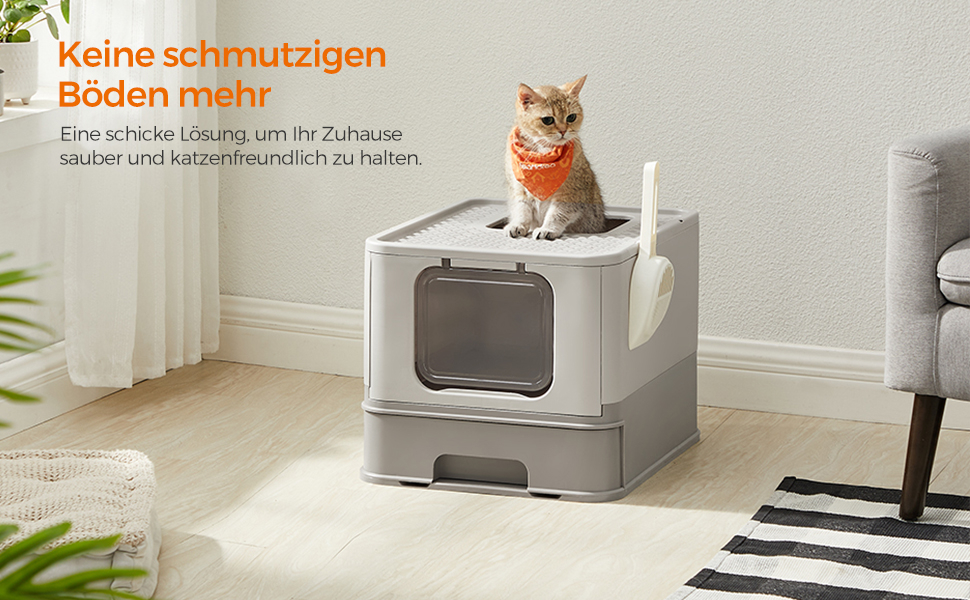 Detalii despre produs: Detalii despre produs: Culoare: Gri cald Material: PP (polipropilena), PC (policarbonat) Dimensiuni: 54,3 x 42,5 x 37,8 cm (L x l x i) Greutate: 3,4 kg Capacitate maxima de incarcare statica pe partea superioara: 15 kg Despre acest articol Mai putina mizerie: Designul cu grila din partea superioara reduce formarea urmelor si permite ca gunoiul sa cada inapoi in cutie. Acest lucru reduce formarea de urme in casa si va mentine casa curataMarginea extinsa deasupra cutiei si fundul inchis dedesubt impiedica scurgerea nisipului pe podea. Un ajutor practic daca pisicii dvs. ii place sa sape. Dimensiunea interioara a tavii este de 50 x 40,5 x 34,5 cm si ofera astfel suficient spatiu pentru pisicile mari. Poate sustine pana la 15 kg.Usa poate fi reglata astfel incat sa se deschida doar pe o parte, iar deschiderea de sus poate fi folosita ca iesire. De asemenea, usa poate fi deschisa pe ambele parti - in functie de nevoile dumneavoastra. Daca pisica dvs. este incepatoare, puteti, de asemenea, sa scoateti usa.Datorita designului pliabil si a instructiunilor usor de urmat, noua litiera pentru pisici a prietenului dvs. este gata in 5 minute sau mai putin.