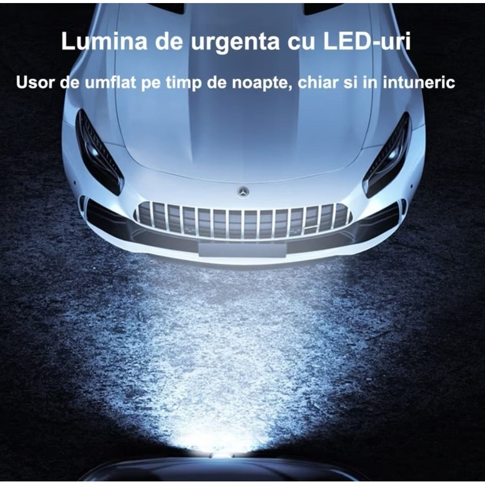 Construit din material ABS și componente electrice de înaltă calitate, oferă performanțe fiabile și durabilitate pe termen lung. Lungimea tubului de inflație de 15 cm permite acces ușor la supapele anvelopelor, iar timpul de încărcare de doar 4 ore asigură o rapiditate sporită în caz de urgență.