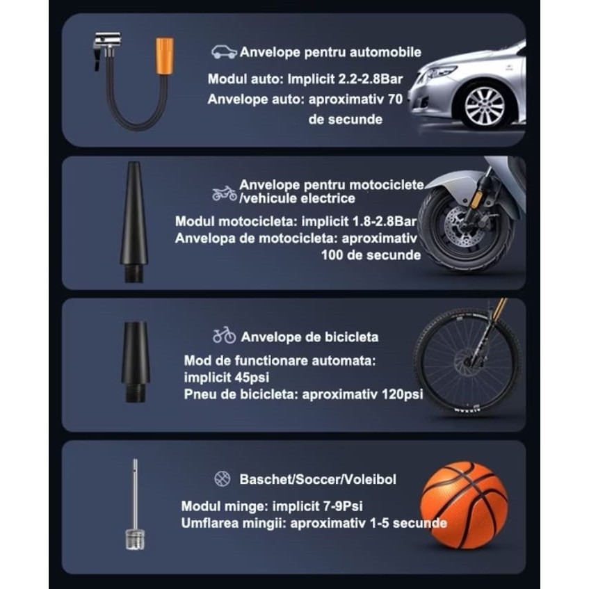 Investește în confort și siguranță cu - pompa de aer multifuncțională care te însoțește oriunde, oferindu-ți libertatea de a avea întotdeauna anvelopele și mingile umflate la presiunea optimă.