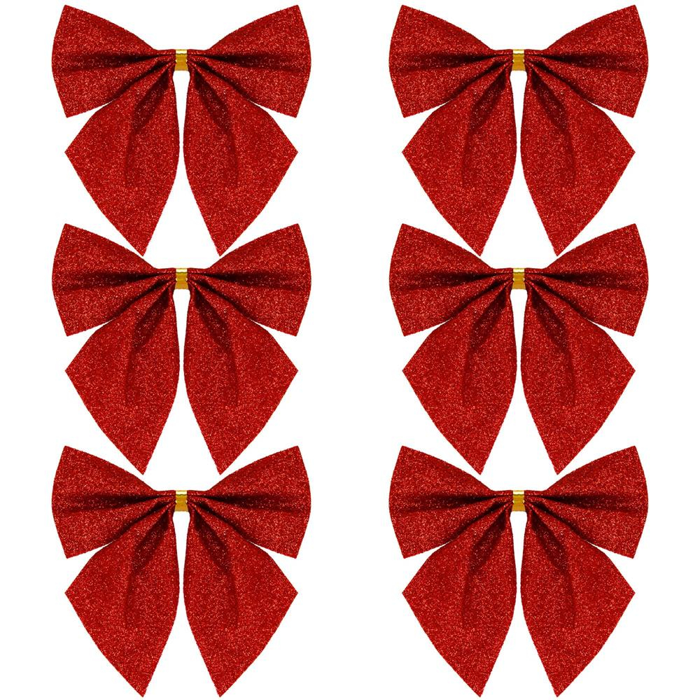Set 6 ornamente pentru bradul de Craciun, fundita, 8cm, rosu cu sclipici