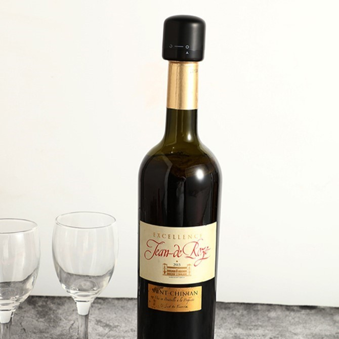 Etans la scurgeri ศi la aer: Dopul are 4 bile din oศel în interior pentru a strânge gâtul sticlei, iar siliconul moale se potriveste la majoritatea sticlelor. Pastrati vinul proaspat pentru mai mult timp.