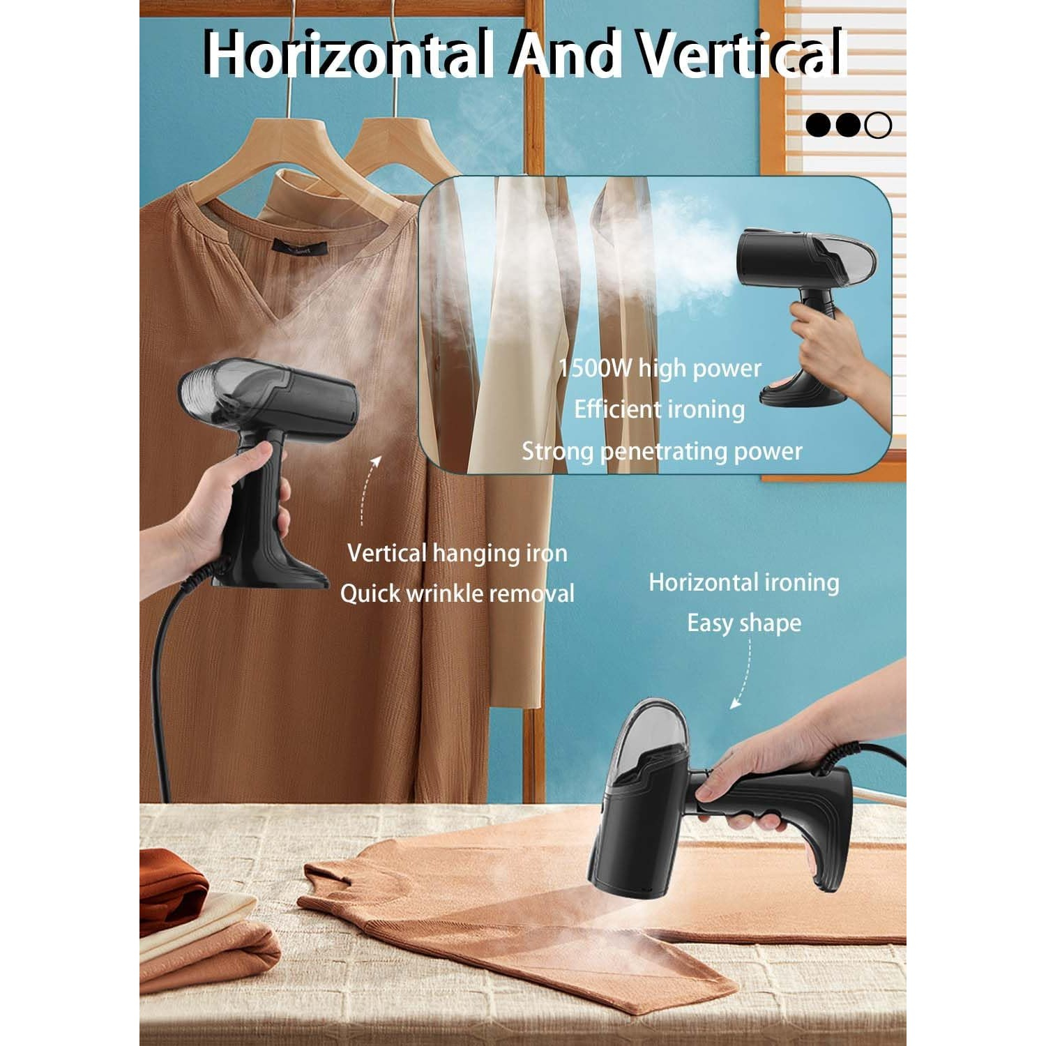 • Putere 1500W: Oferă o încălzire rapidă și o producție constantă de abur, reducând timpul necesar pentru a elimina cutele de pe haine.