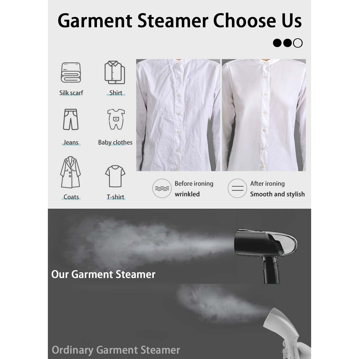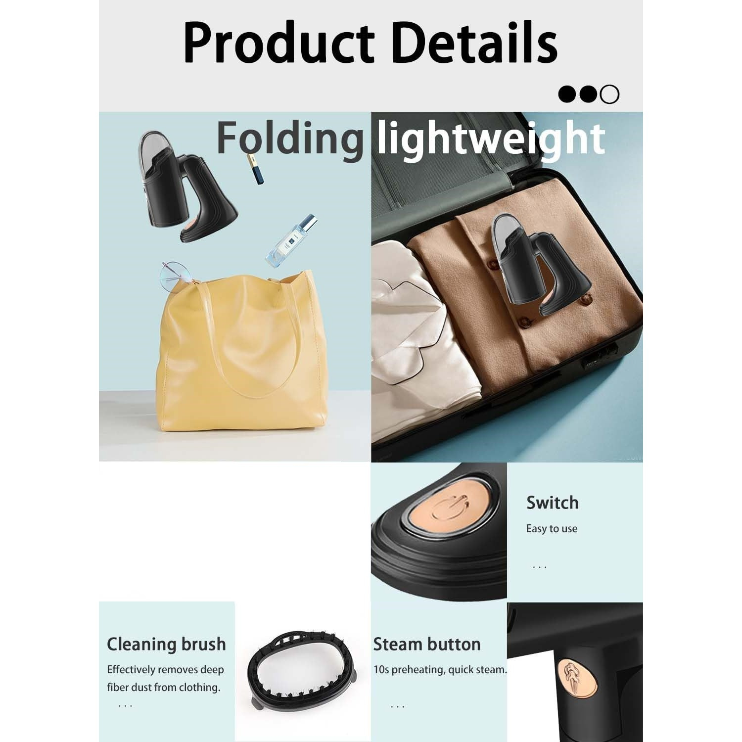 • Design portabil și ușor: Greutatea redusă și dimensiunile compacte fac din acest aparat un accesoriu perfect pentru călătorii. Îl poți lua cu tine oriunde, garantându-ți haine impecabile la fiecare destinație.
