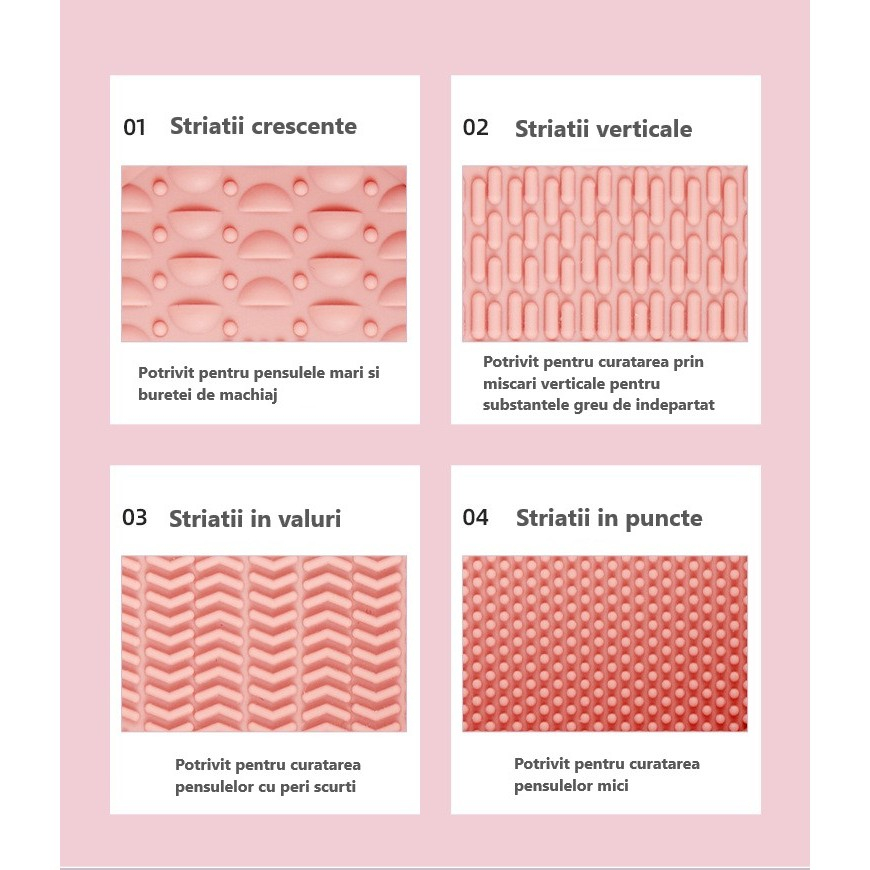 Accesoriul are diferite striatii ce fac mai usoara curatarea pensulelor. Partea cu striatii este utilizata pentru a spala in profunzime pensulele iar partea adanzita permite spalarea bureteilor de make up sau asezarea pensulelor dupa curatare ca suport pentru uscare.