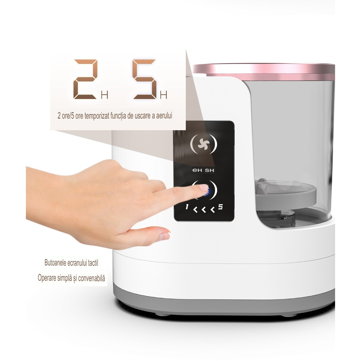După spălare, pensulele pot fi uscate direct în aparat, în două moduri: 2h (rapid) sau 5h (complet) – fără a fi nevoie de echipamente suplimentare.