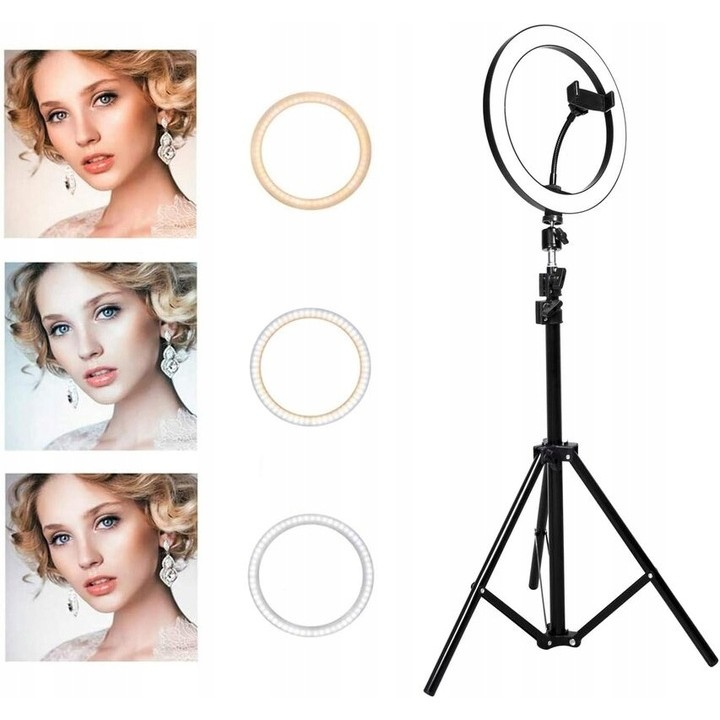 Lampa inelara cu un diametru de 26 cm cu posibilitatea de a schimba culoarea luminii si un trepied extensibil pana la o inaltime de 210 cm. Setul de iluminat perfect pentru fiecare fotograf amator.