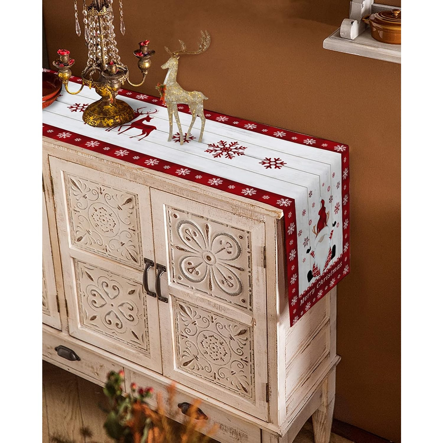 Față de Masă Crăciun, , Model 1 Elfi și Reni, din Textil, 33 x 180 cm, Alb/Roșu