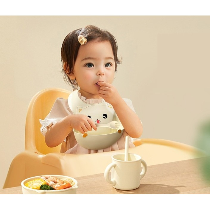 Set 2 Piese Diversificare Bebeluși și Copii din Silicon, , Model Pisicuță, Bej, Fără alergeni, potrivit >12 luni