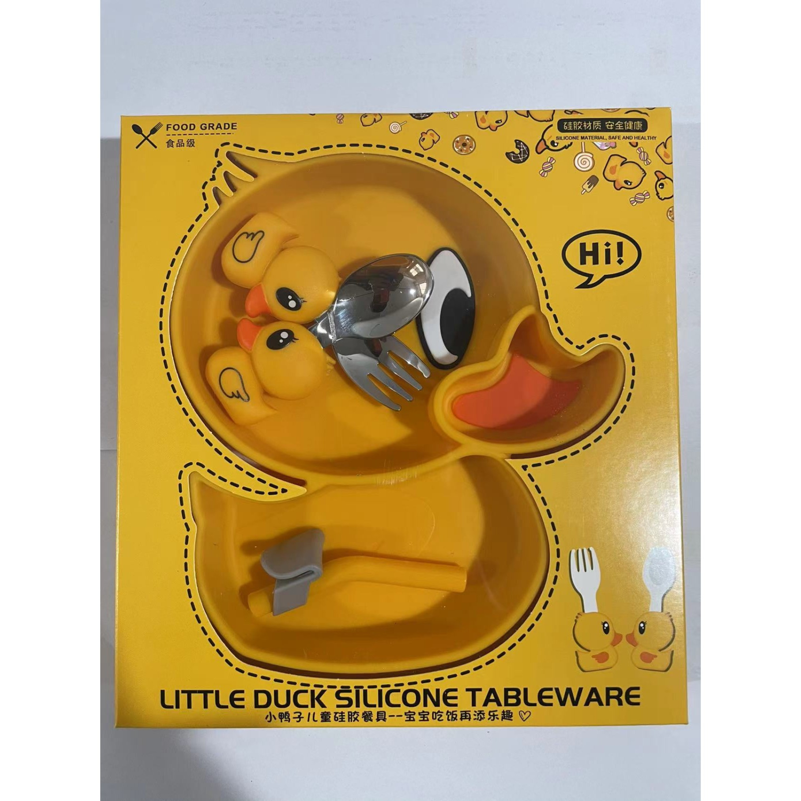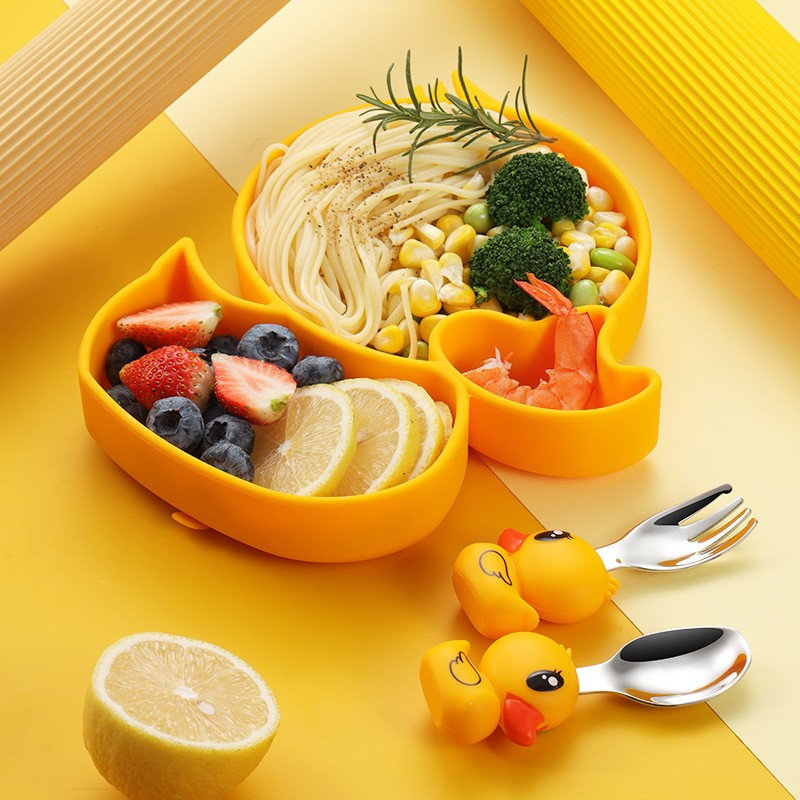Design creativ și funcțional: Setul vine cu o farfurie compartimentată în formă de ratusca, care nu numai că este distractivă și atrăgătoare pentru bebeluși, ci și practică în organizarea diferitelor tipuri de alimente. Această formă creativă poate încuraja copilul să exploreze și să se bucure de mese. Lingurița și furculița incluse sunt concepute pentru a fi ușor de utilizat de către mânuțele mici ale bebelușilor și le ajută să își dezvolte abilitățile de hrănire.