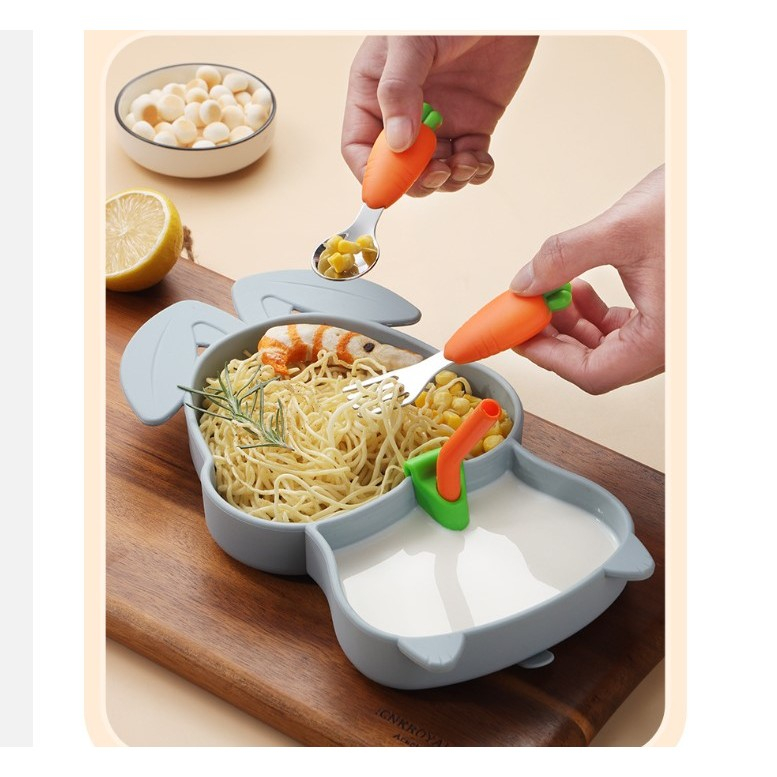 Design creativ și funcțional: Setul vine cu o farfurie compartimentată în formă de iepure, care nu numai că este distractivă și atrăgătoare pentru bebeluși, ci și practică în organizarea diferitelor tipuri de alimente. Această formă creativă poate încuraja copilul să exploreze și să se bucure de mese. Lingurița și furculița incluse sunt concepute pentru a fi ușor de utilizat de către mânuțele mici ale bebelușilor și le ajută să își dezvolte abilitățile de hrănire.
