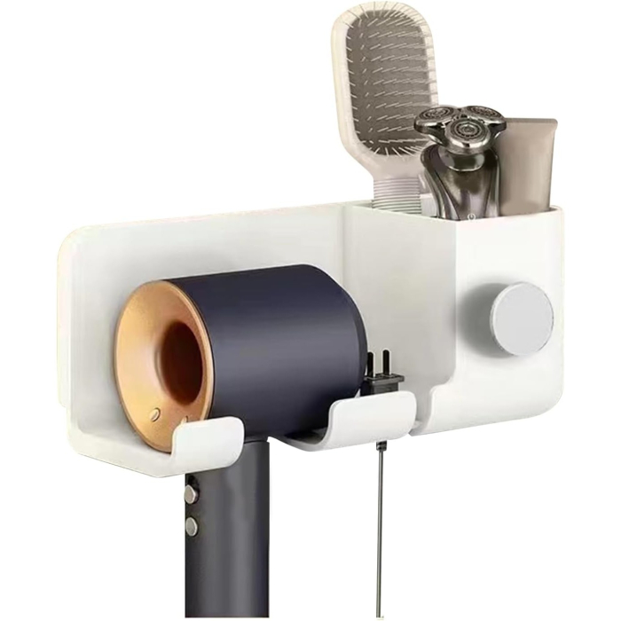 Suport de Baie, , pentru Uscator de Par, cu Organizator Dublu, din Plastic, Aplicare cu Suport Adeziv, 23 x 8.8 x 9.5 cm, Alb