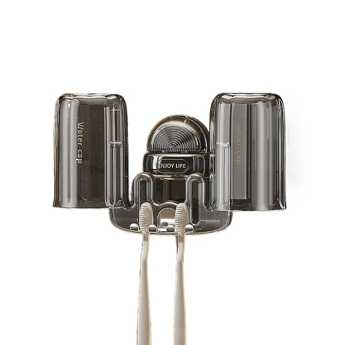 Suport Multifunctional Dublu, Pahar si Suport pentru Periuta de Dinti, , Plastic, 11 cm x 11.5 cm, Gri