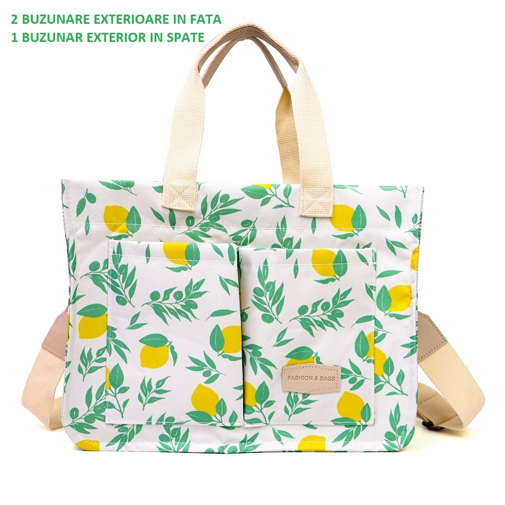 Geanta de Mana/Umar, Multifunctionala, , Inchidere cu Capsa, Imprimeu Lamai, Material Textil, 33.5 x 25 x 14.5 cm, Alb/Galben