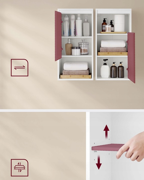 Detalii produs: Culoare: Alb cu bej Material: Placi aglomerate din lemn Dimensiuni: 30 x 40 x 80 cm (D x W x H). Max. Capacitate de incarcare statica per raft: 15 kg. Max. Capacitate totala de incarcare statica: 60 kg Note: Acest dulap nu este potrivit pentru peretii din gips-carton. Nu expuneti dulapul la umiditate pentru o perioada lunga de timp pentru a evita fisurile si deformarea. Despre acest articol Usor de curatat podeaua de dedesubt: Deoarece acest mobilier de baie este agatat, lasa spatiu pentru curatarea podelei de dedesubt si previne acumularea de praf si murdarie. Spatiu de depozitare deschis si inchis: Raftul deschis face ca obiectele utilizate frecvent sa fie usor accesibile, in timp ce compartimentele din spatele usii pastreaza obiectele dvs. intime departe de vedere si ascund astfel dezordinea. Usa flexibila: Puteti monta usa acestui dulap de baie in zona superioara sau inferioara, la stanga sau la dreapta pentru a-l adapta camerei si preferintelor dvs. Raft reglabil: Acest dulap are un raft reglabil pe inaltime pentru a gazdui articole de toaleta de diferite dimensiuni. Asamblare usoara: Datorita pieselor marcate si instructiunilor detaliate, puteti asambla acest dulap de perete fara probleme.