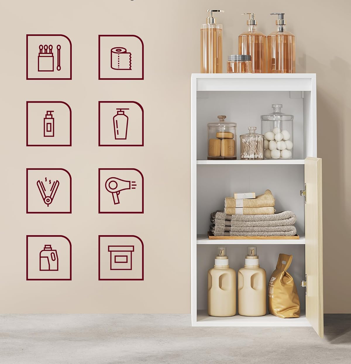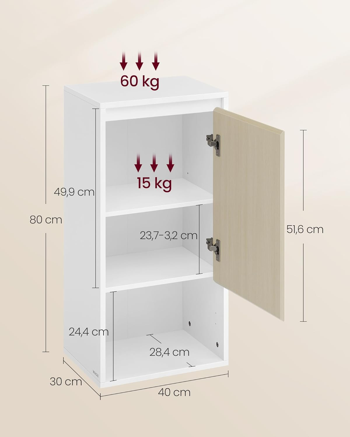 VASAGLE Dulap de baie de perete cu 3 polite, usa cu directie de deschidere reglabila, 30x40x80 cm, alb cu bej