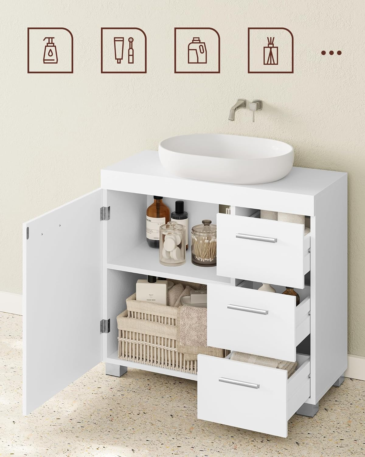 Specificatii tehnice Brand: VASAGLE Material: MDF (placi lemnoase) Culoare: Albย  Dimensiuni produs: 30 x 70 x 64 cm Montaj: Se monteaza pe perete Stil: Modern Tip compartimentare: 3 sertare laterale, 2 compartimente cu usa Utilizare recomandata: Sub chiuveta, baie Caracteristici speciale: Raft ajustabil pe 3 niveluri, sistem anti-rasturnare inclus Scurta descriere Acest dulap de baie VASAGLE este proiectat special pentru a se potrivi sub lavoare cu sau fara coloana. Cu 3 sertare laterale si 2 compartimente spatioase in spatele unei usi, ofera solutii eficiente pentru depozitarea prosoapelor, detergentilor si accesoriilor de baie. Raftul interior ajustabil in 3 pozitii permite organizarea sticlelor de diverse dimensiuni, iar constructia robusta din MDF este rezistenta si usor de curatat. Caracteristici principale Potrivit pentru lavoar cu sau fara coloana 3 sertare si 2 compartimente pentru organizare eficienta Raft interior reglabil pe inaltime Structura stabila cu dispozitiv anti-rasturnare Design modern in nuanta alb cloud