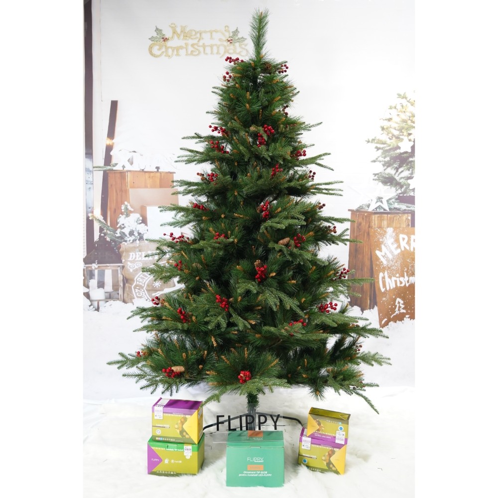 Brad artificial de Craciun, decorat cu conuri pin rosii, pentru interior/exterior, inaltime 210 cm, diametru 142 cm, 767 ramuri, , verde, suport metalic inclus