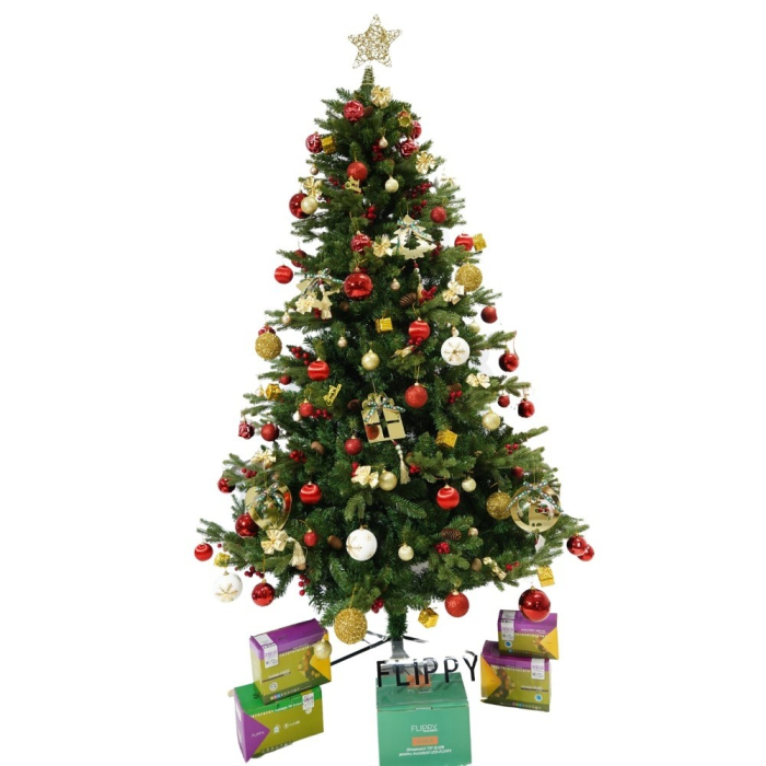 Set brad artificial de Craciun si elemente decorative, decorat cu conuri pin rosii, inaltime 210 cm, diametru 137 cm, 1172 ramuri, , verde, suport metalic inclus