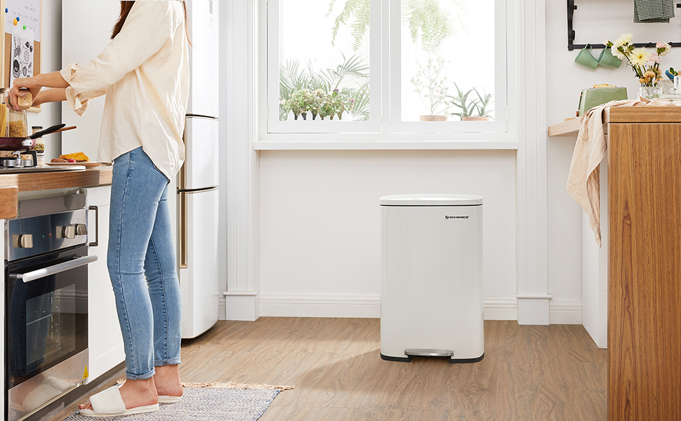Caracteristici: Culoare: alb Materiale: Cos de gunoi din otel, galeata interioara din plastic Dimensiunile produsului (fara pedala): 42,5 x 31,8 x 66 cm (L x l x ih) Inaltime cu capacul deschis: 93,4 cm. Dimensiunile interioare: 41 x 25 x 58,5 cm (L x l x ih) Dimensiuni pedala: 19,5 x 5,8 cm (L x l) Volum: 50LP Greutate: 6,2 kg. Despre acest articol Cu un volum de 50L si dimensiuni de 42,5 x 31,8 x 66 cm, acest cos de gunoi ofera o multime de spatiu fara a aglomera camera. Designul sau modern se potriveste cu multe amenajari interioare.Acest cos de gunoi cu pedale are un capac care se inchide incet si fara zgomot. Sigiliul capacului rezistent la scurgeri si impiedica raspandirea mirosurilor.Capacul acestui cos de gunoi de bucatarie poate fi deschis cu ajutorul pedalei sau cu mainile deasupra punctului de blocare, astfel incat sa ramana deschis.Fabricat din otel de calitate, acest cos de gunoi modern este rezistent la rugina pentru o utilizare indelungata, este usor de curatat cu o carpa umeda pentru a preveni aparitia dungilor.Sacii de gunoi pot fi fixati prin plierea marginilor sacilor in orificiul din spate al galetii interioare detasabile. Daca este necesar, manerul din spate poate fi utilizat pentru a-i schimba locul.