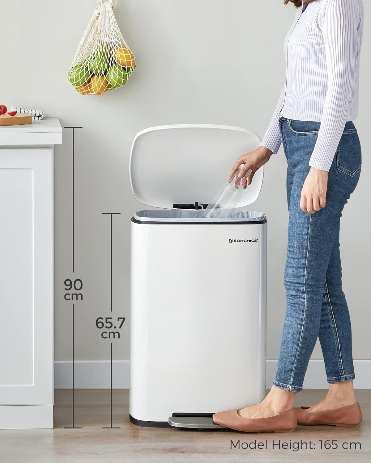 SONGMICS Cos de gunoi din otel cu pedala, galeata interioara plastic, capac inchidere lenta, 50L, 43x32x66cm, alb