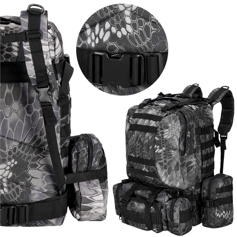 Material: poliester Catarame cu clichet: plastic Capacitate: 50L Rezistent la apa Inchidere: fermoar Buzunare laterale detasabile Dimensiuni: Inaltime totala 50 cm Latime totala 50 cm Adancime totala 40 cm Latimea compartimentului principal 30 cm Sistem de transport reglabil: 40 - 67 cm Catarama de centura reglabila: 36 - 70 cm  Rucsacul nostru a fost dotat cu numeroase compartimente suplimentare, detasabile, un sistem Molle de neinlocuit, sisteme de transport reglabile, o centura pentru solduri si o serie de alte avantaje: Rezistent la apa - materialul din poliester, in plus fata de interiorul cauciucat, asigura o protectie adecvata Sistem Molle - permite depozitarea si montarea altor accesorii importante Amelioreaza presiunea asupra coloanei vertebrale si a umerilor in timpul utilizarii Maner de transport - in partea superioara a rucsacului Catarame de blocare - continutul rucsacului este foarte bine protejat Buzunar ascuns 2x compartimente principale - foarte incapatoare In plus fata de compartimentul principal spatios, am echipat rucsacul nostru cu compartimente si buzunare suplimentare. Ca urmare, fiecare obiect din echipamentul dvs. isi va gasi locul in rucsac. In ciuda dimensiunilor sale mai mari, produsul are o greutate redusa, astfel incat confortul de utilizare este intotdeauna la un nivel ridicat. Rucsacul este dotat cu accesorii practice, care cu siguranta va vor fi de folos in timpul calatoriilor si vor creste confortul de utilizare: Curele reglabile: curele de sold si de umar. Elemente de spuma - pe spate si pe curelele de umar Buzunar ascuns pe spate Catarame din plastic, durabile Baza cauciucata a compartimentului principal Interiorul cauciucat al compartimentelor suplimentare Maner superior pentru al purta in mana