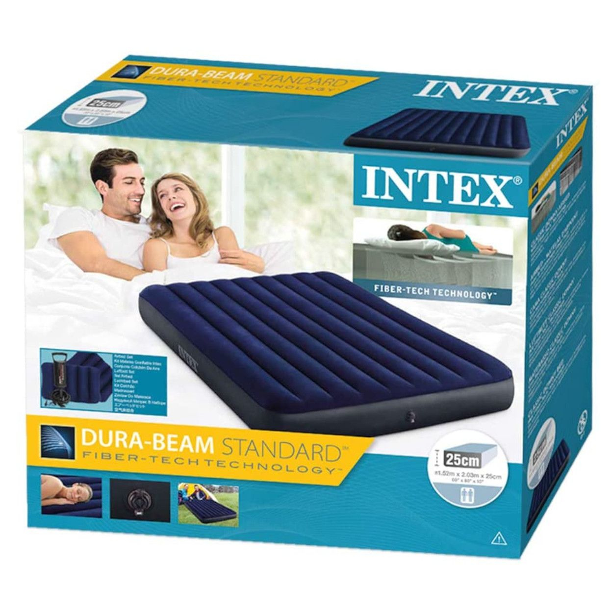 Intex 64765 Queen Dura Beam Standard Classic Downy Air Bed 152x203x25 cm Patul gonflabil Intex 64765 Queen Dura Beam Standard Classic Downy Air Bed este conceput pentru cei care iubesc campingul.Fabricat din vinil albastru ultra-rezistent care suporta pana la 273 kg de greutate, precum si oferind o suprafata foarte solida si confortabila datorita structurii sale cu nervuri care dispune de tehnologia noastra Wave-Beam, este rezistent la apa si este echipat cu o supapa dubla pentru o umflare / dezumflare rapida.Partea superioara este captusita cu un material special flocat, care este incredibil de moale la atingere si, in plus, este rezistent la apa, ceea ce adauga si mai multa valoare.Este o saltea robusta si foarte stabila, unde puteti dormi linistit toata noaptea, fara a risca sa se goleasca in mijlocul noptii. Din acest motiv, ea contine, in supapa de umplere, sistemul Air-Lock care impiedica orice pierdere de aer, chiar si sub presiune.Supapa doi in unu va permite sa umflati salteaua in cateva minute, folosind o pompa manuala inclusa in kit. De asemenea, puteti folosi o pompa electrica (nu este inclusa), in cazul in care aveti nevoie sa accelerati procesul de umflare.Sunt incluse doua perne I-Beam si pompa de aer; aceasta este compusa din tehnologia Fiber-tech care ofera combinatia perfecta de stabilitate si confort.Dezumflarea si plierea lor este la fel de usoara si rapida, permitand depozitarea in orice spatiu, deoarece dobandeste o forma foarte compacta dupa golire. Specificatii Culoare albastraDimensiuni: 152x203x25 cmSistem de laminare a valurilor foarte puternic pentru o stabilitate sporitaTehnologie Fiber-Tech care asigura o stabilitate maximaInclusiv  2 perne independente I-Beam (43x28x9 cm)Materiale: Vinil, suprafata flocataPompa manualaImpermeabil, rezistent la apaSupapa 2in1