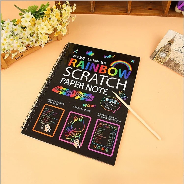 Caietul cu foi de hârtie de răzuit este alegerea ideală pentru cei mici și pasionații de artă, oferind o experiență creativă unică. Fiecare pagină ascunde un fundal curcubeu vibrant, care se dezvăluie pe măsură ce desenezi sau scrii cu stiloul inclus. Perfect pentru activități artistice, relaxare și dezvoltarea imaginației.