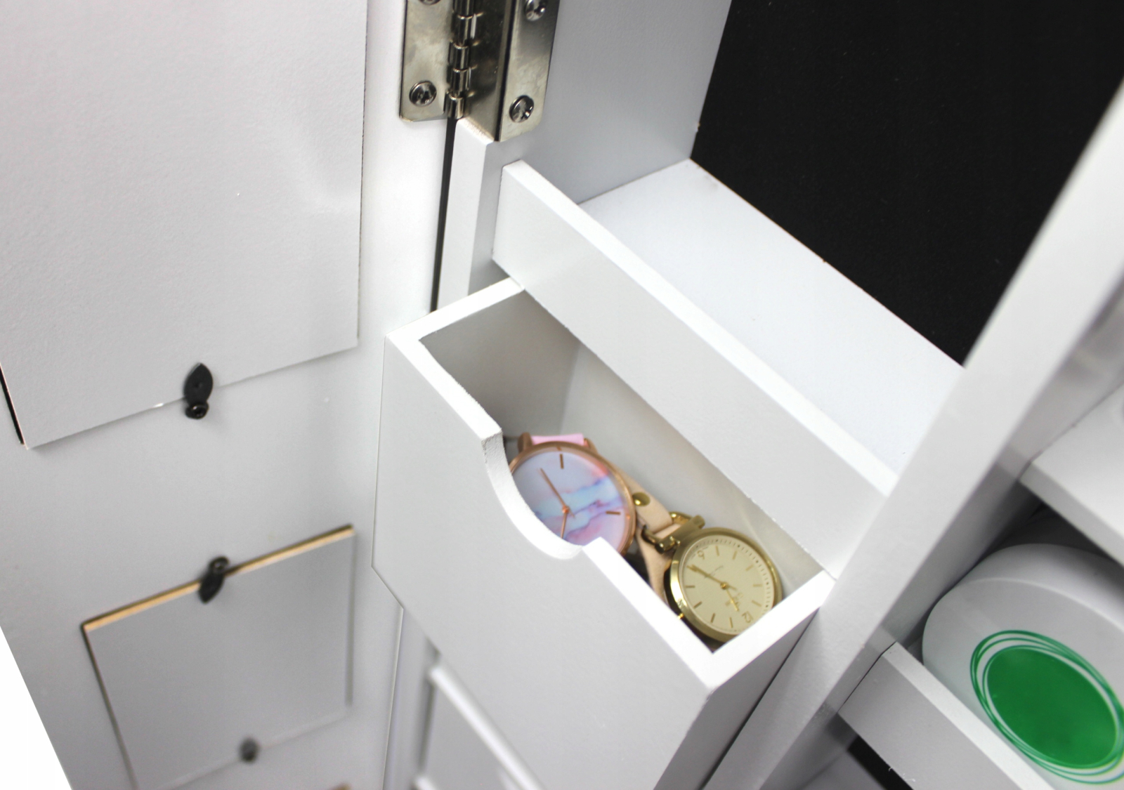 Un dulap de bijuterii cu oglinda este cu siguranta o idee grozava de cadou pentru fiecare femeie. Poate gazdui un numar mare de coliere, inele, bratari si ceasuri. Interiorul tapitat aduce un plus de farmec si eleganta, iar oglinda exterioara este, dupa cum stie toata lumea, un must-have in fiecare dormitor. Nu este doar o solutie practica pentru depozitarea bijuteriilor, ci si un element decorativ elegant care va adauga farmec oricarui dormitor. Oglinda mare Captusita cu plus moale Carlige, pandantive, rafturi si sertare pentru bijuterii 5 sloturi foto Stil victorian modern Fabricat din placa de mobilier MDF Blocabil cu cheie Oglinda mare O oglinda exterioara este un element extrem de util al fiecarui dormitor. Datorita acesteia, fiecare femeie poate verifica cu usurinta modul in care bijuteriile sale se potrivesc cu tinuta ei, ceea ce faciliteaza alegerea accesoriilor potrivite. Este si un element decorativ care mareste vizual spatiul si confera dormitorului un caracter elegant. O camera pentru bijuteriile tale Acest dulap va permite sa organizati si sa depozitati o cantitate mare de bijuterii, inclusiv coliere, inele, bratari si ceasuri. Datorita carligelor, pandantivelor, raftului si sertarelor special concepute, bijuteriile tale vor fi intotdeauna usor accesibile si perfect organizate. Interior elegant Interiorul dulapului este tapitat cu plus moale, care nu numai ca protejeaza bijuteriile impotriva zgarieturilor si deteriorarii, dar ii confera si un farmec si o eleganta unica. Fiecare detaliu a fost atent luat in considerare pentru a evidentia frumusetea articolelor depozitate. Stocarea Amintiri Dulapul de bijuterii are si spatiu pentru cinci fotografii, permitandu-va sa stocati amintiri importante si fotografii indragite intr-un singur loc. Aceasta este modalitatea perfecta de a adauga o nota personala colectiei tale de bijuterii.