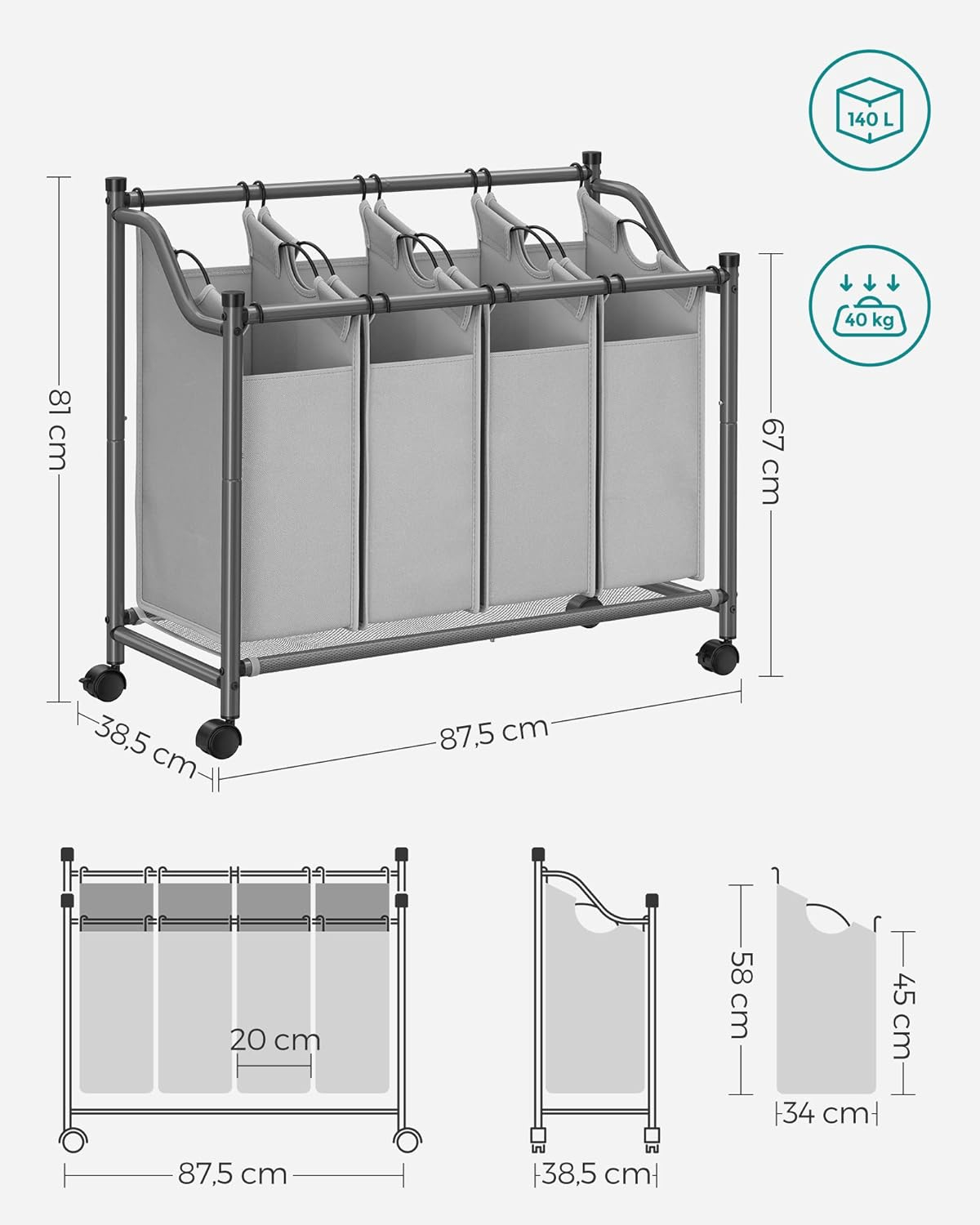 SONGMICS Cos de rufe cu 4 saci detasabili, structura metalica pe roti, 4x35L, 87x38x81cm, gri