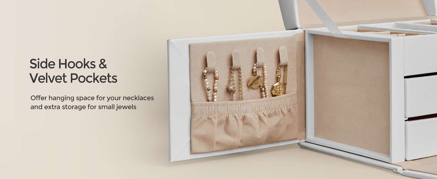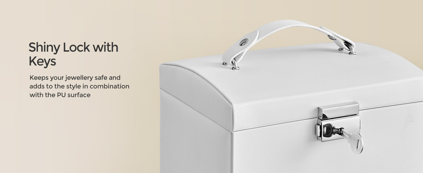 Culoare: Alb clasic Material: MDF (placi de fibre de densitate medie), PU (poliuretan), captuseala din catifea Stil: Modern Caracteristica speciala: oglinda, lacat, portabil Dimensiunile produsului: 13,8D x 17,7W x 13,5H centimetri Forma: Dreptunghiular Despre acest articol Pastrati-va diversele bijuterii organizate cu aceasta cutie spatioasa de bijuterii. Are mai multe carlige pentru colier pe ambele parti si 3 niveluri de depozitare cu o multime de compartimente diferite. Incuiat si portabil: Organizatorul de bijuterii se incuie cu 2 chei pentru a va pastra piesele pretuite departe de copii; Datorita manerului din partea superioara, husa de bijuterii mica este portabila. Cu oglinda interioara:  Aceasta cutie de bijuterii are o oglinda transparenta pe capac pentru a va face mai convenabil sa va machiati, sa va puneti sau sa scoateti bijuterii si sa va verificati aspectul inainte de a iesi. Solid si durabil: Suprafata din piele sintetica de calitate, un corp robust din MDF si cusaturile ingrijite fac o cutie de bijuterii de calatorie durabila, care va va tine companie multi ani de acum inainte. Un cadou minunat: Daruiti acest organizator de bijuterii elegant si bine realizat celor dragi de ziua lor de nastere sau aniversare pentru a le surprinde! Sau, rasfatati-va cu aceasta fermecatoare cutie de bijuterii - o meriti!