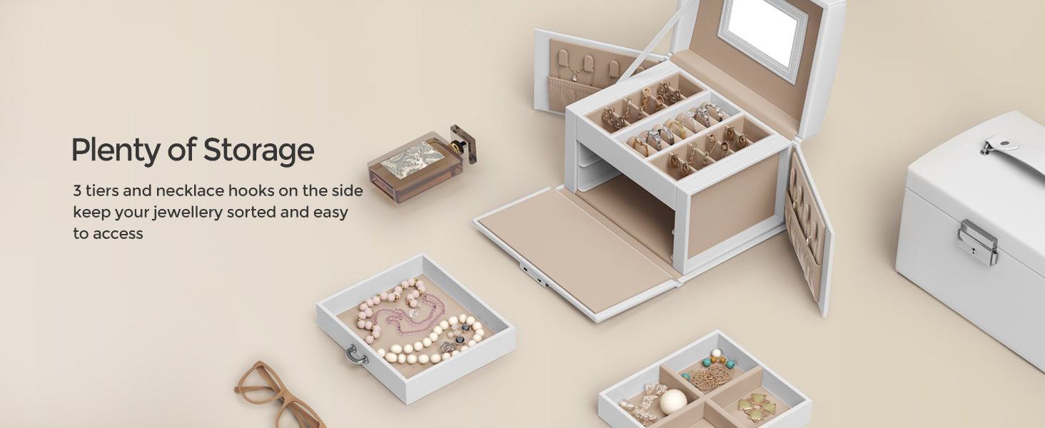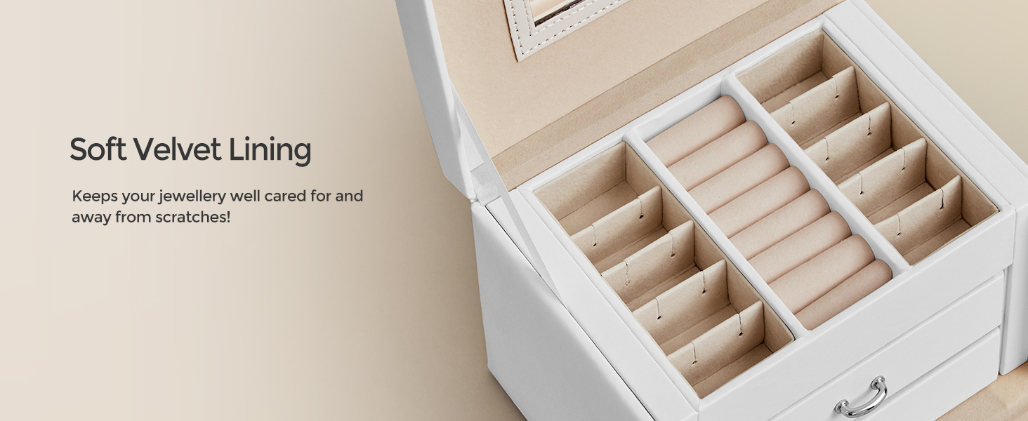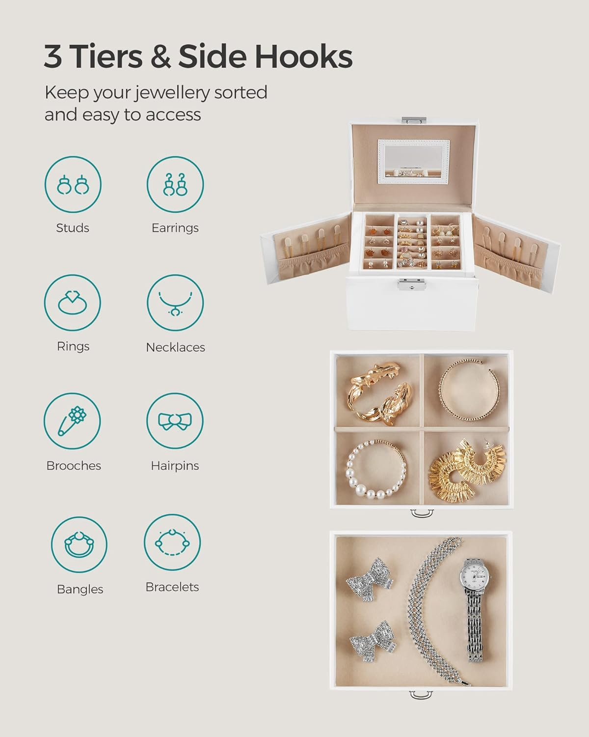 SONGMICS Cutie de bijuterii cu 3 niveluri, oglinda, incuietoare cu maner, 2 sertare, 14x18x14cm, alb