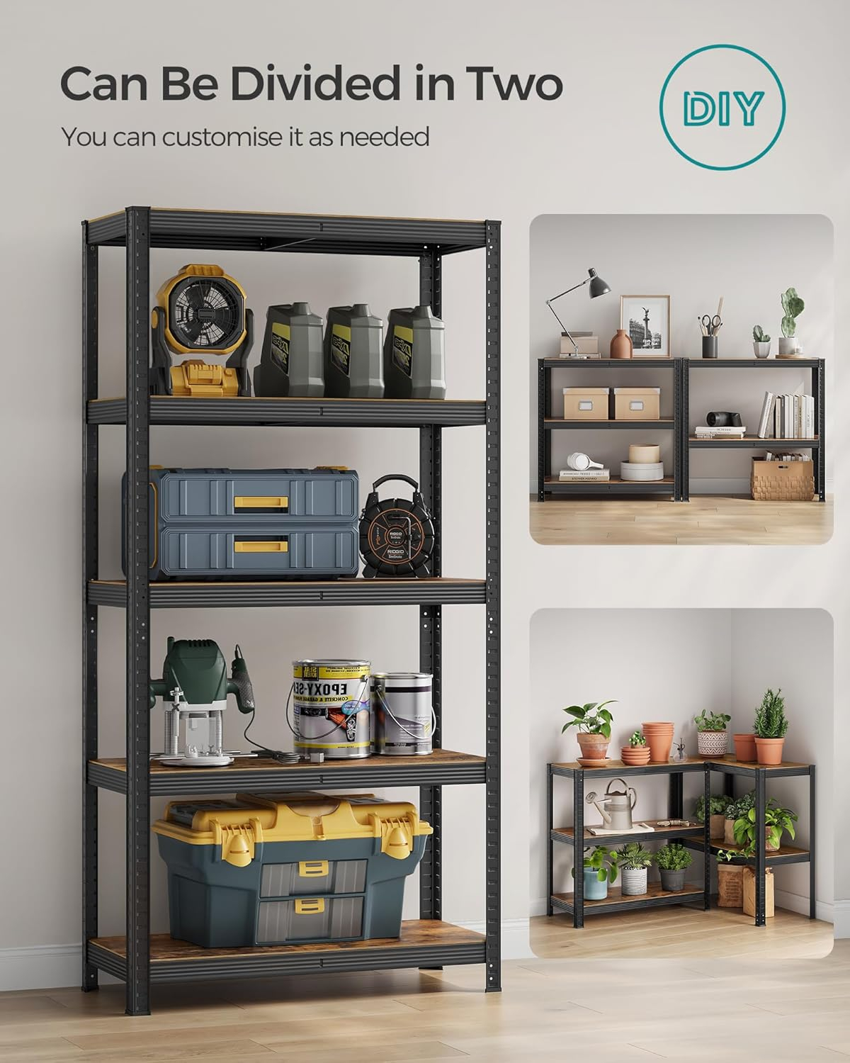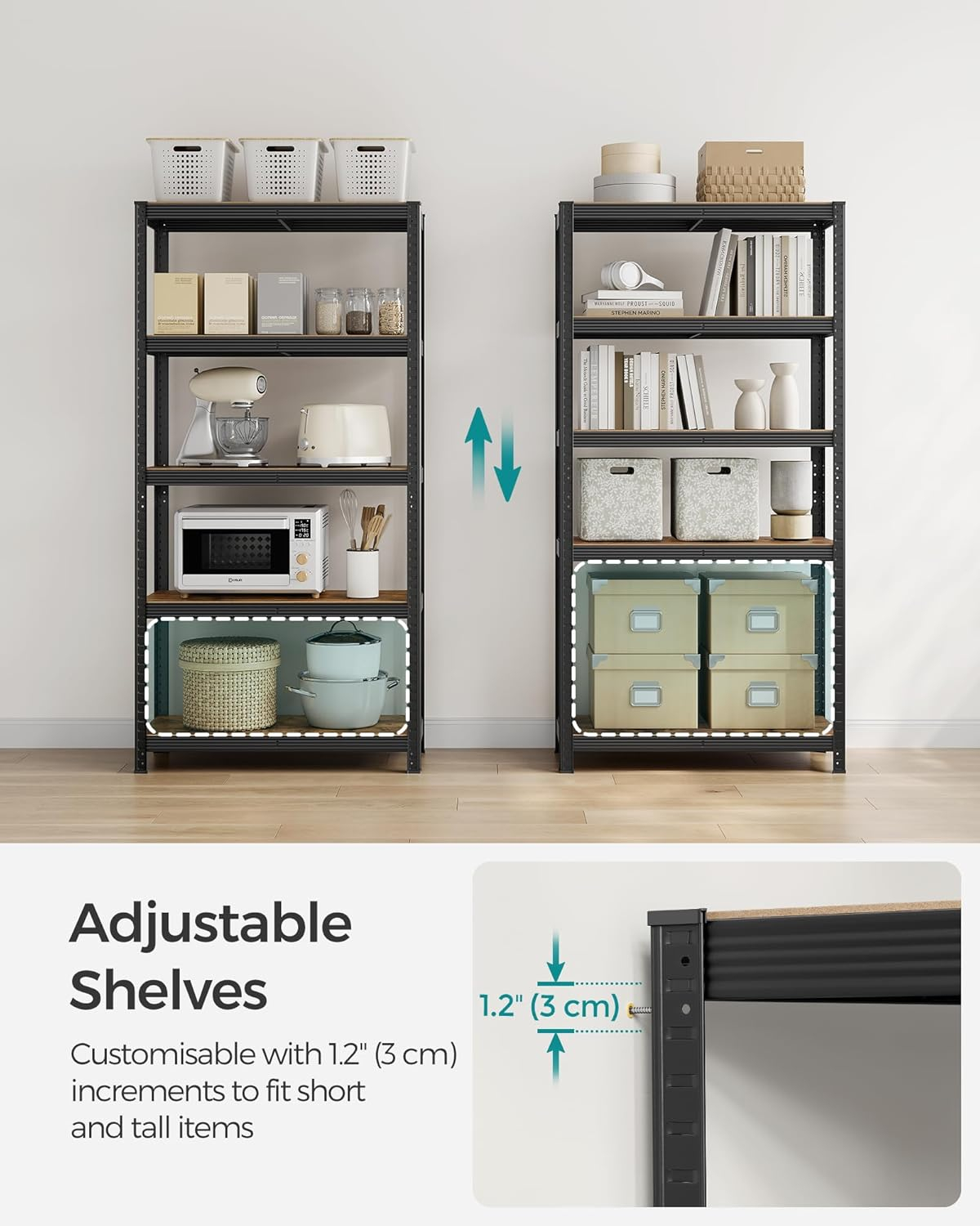Specificatii: Culoare: Maro rustic, Negru Material: Cadru din otel, placi aglomerate Dimensiunea produsului: 40 x 90 x 180 cm (D x W x H) Max. Capacitate de incarcare statica pe nivel: 175 kg Total Max. Capacitate de incarcare statica: 875 kg Despre acest articol Rafturile robuste din placi aglomerate sunt sustinute de cadrul din otel cu bare de armare suplimentare, fiecare raft poate sustine pana la 175 kg si sustine in siguranta vopsele, unelte si echipamente de fitness. Rafturile unitatii de rafturi sunt finisate cu granulatie de lemn maro rustic, adaugand un efect elegant oricarui spatiu, astfel incat sa puteti spune adio aspectului plictisitor.Unitatea de rafturi poate fi impartita in doua rafturi joase separate, unul plasat in bucatarie ca suport pentru cuptor si cuptor cu microunde, celalalt in birou pentru a tine carti, plante, imprimanta si multe altele. Asamblarea raftului de depozitare nu necesita unelte, piesele pot fi conectate intre ele cu ajutorul imbinarilor cu fanta, iar inaltimea dintre rafturi poate fi ajustata pentru depozitare flexibila.Kitul anti-inclinare inclus va ajuta sa fixati raftul pe perete, astfel incat raftul sa fie mai stabil pentru o utilizare sigura.