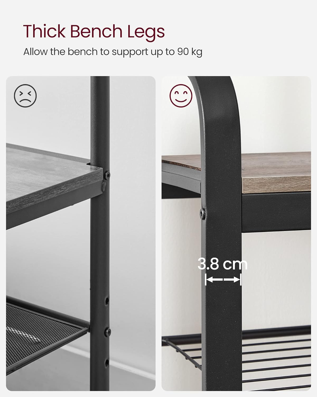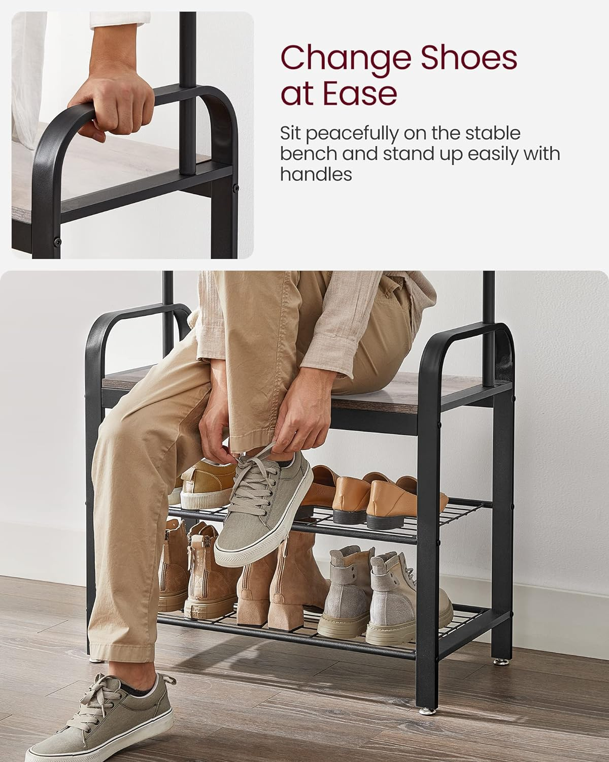 VASAGLE Cuier pentru haine cu banca de depozitare pantofi, cu 9 carlige si sina pentru haine, 34x72x183 cm, gri si negru