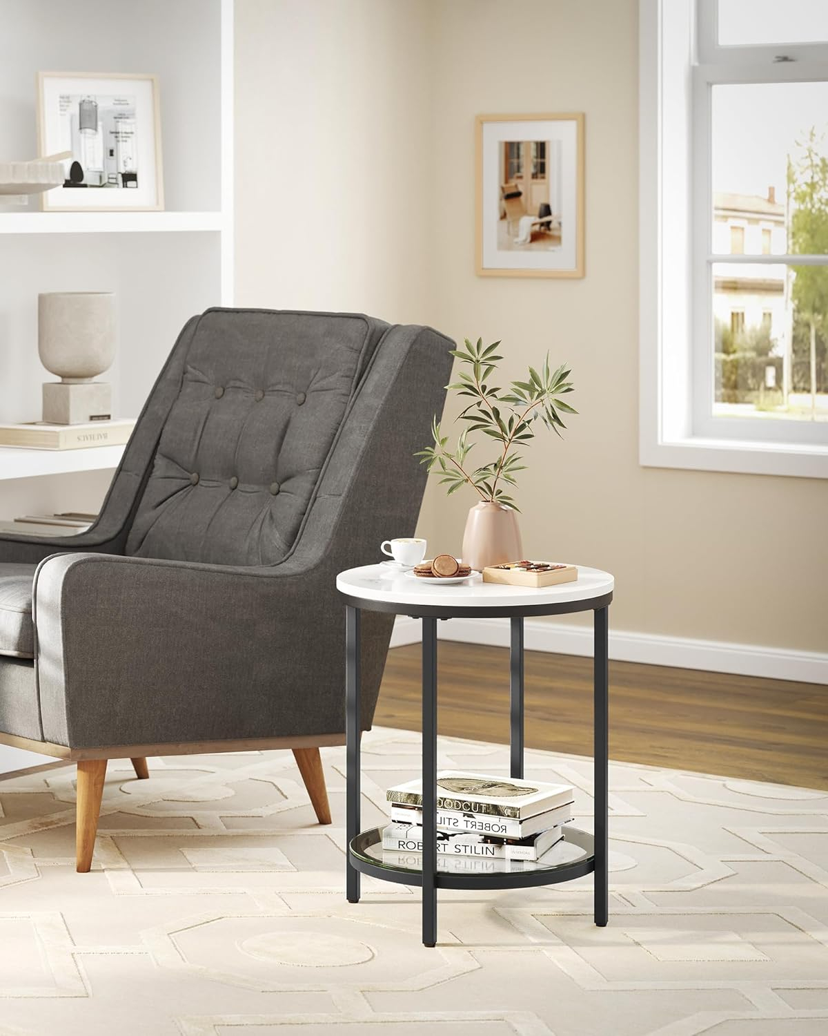 VASAGLE Masa rotunda, cu cadru de otel, noptiera, 45x55cm, negru cu blat alb aspect marmura