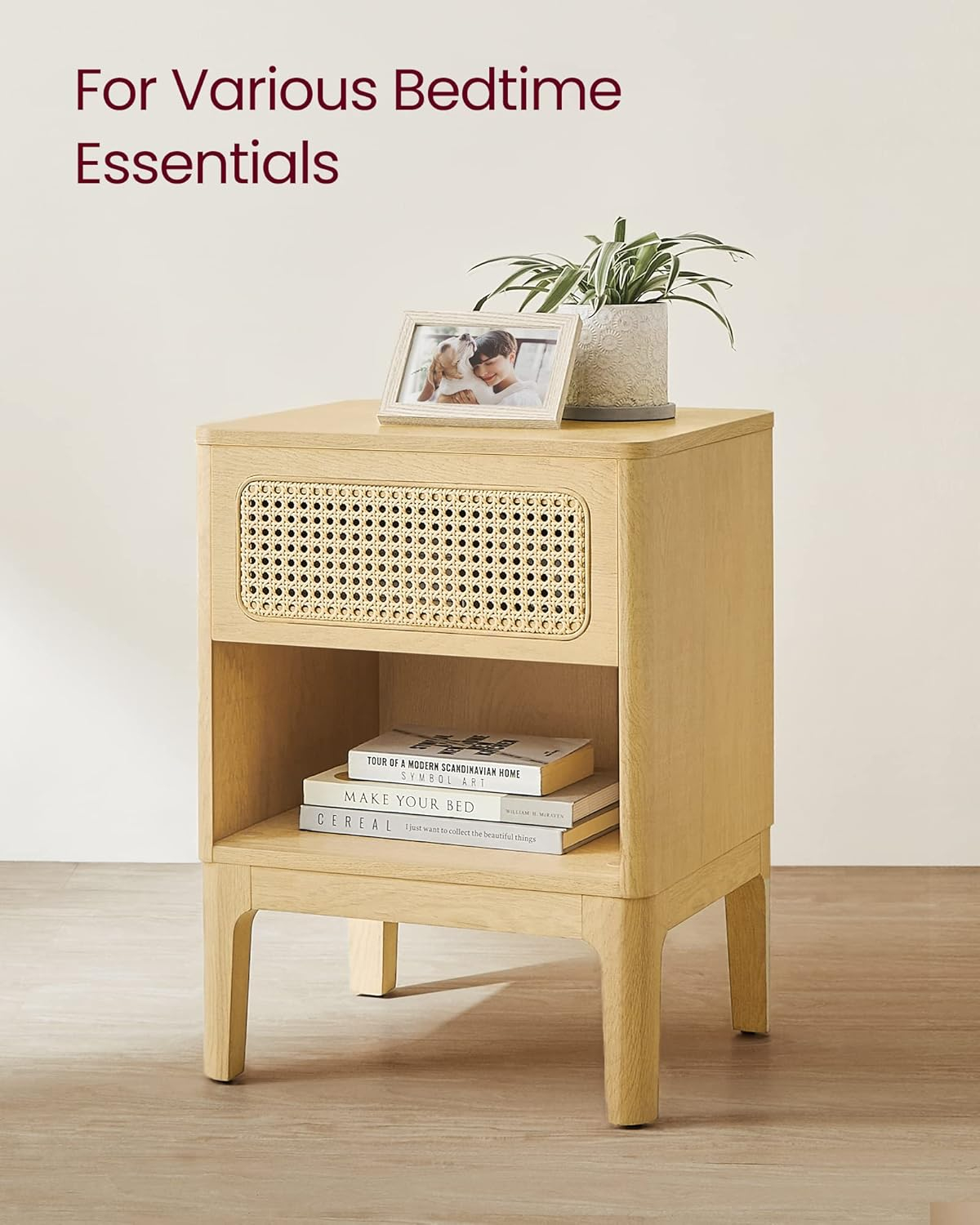 VASAGLE Noptiera 45x40x60 cm, cu sertar aspect ratan si raft, stil boho, PAL si MDF, natur