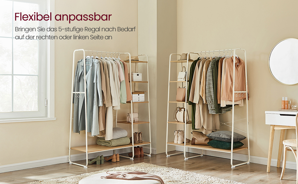 VASAGLE Raft pentru haine cu suport pentru pantofi, 5 polite, 6 carlige laterale, 45x120x160cm, alb
