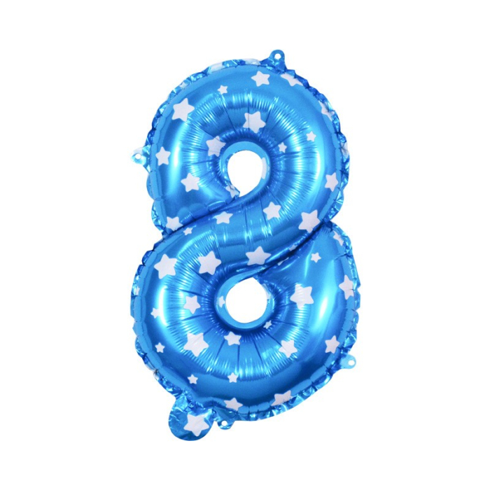 Balon din Folie Metalizata , Figurina Cifra, Imprimeu Stele, Tema Aniversare 80 cm, Ambalaj Individual, Pai inclus, Umflare cu Aer sau Heliu, Albastru, Cifra 8