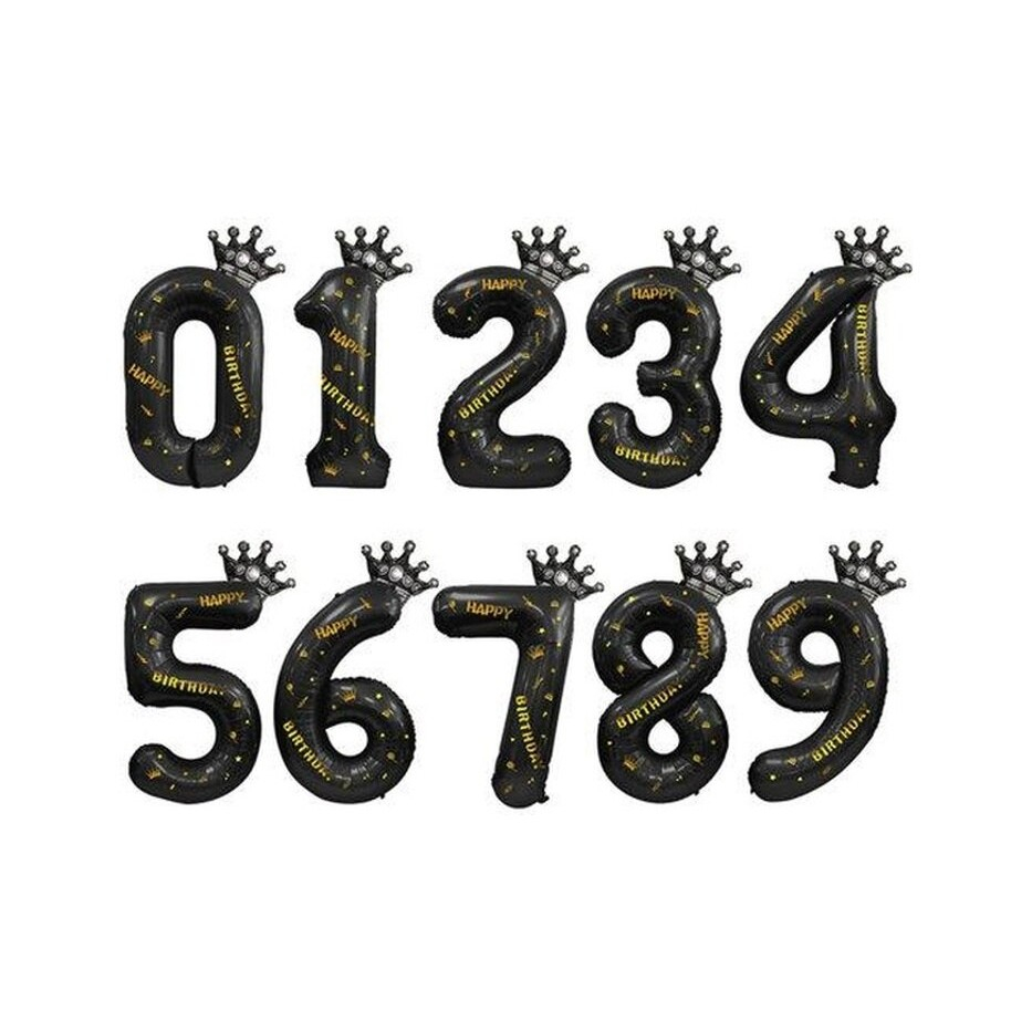 Balon din Folie Metalizata , Figurina Cifra si Coroana, Scris Happy Birthday, Tema Aniversare 100 cm, Ambalaj Individual, Pai inclus, Umflare cu Aer sau Heliu, Negru, Cifra 2