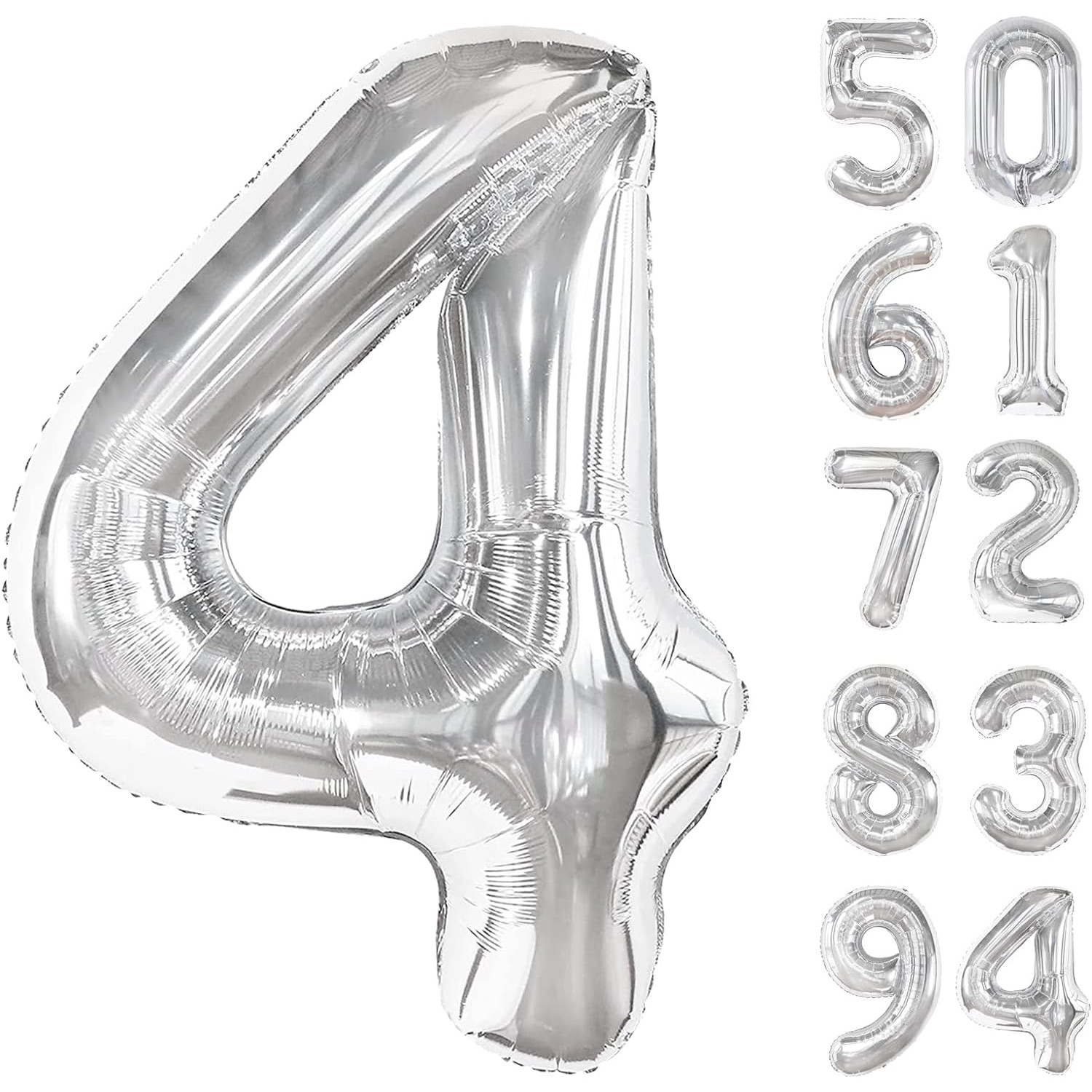 Balon din Folie Metalizata, , Figurina Cifra, Tema Aniversare 40 cm, Ambalaj Individual, Pai inclus, Umflare cu Aer sau Heliu, Argintiu, Cifra 4