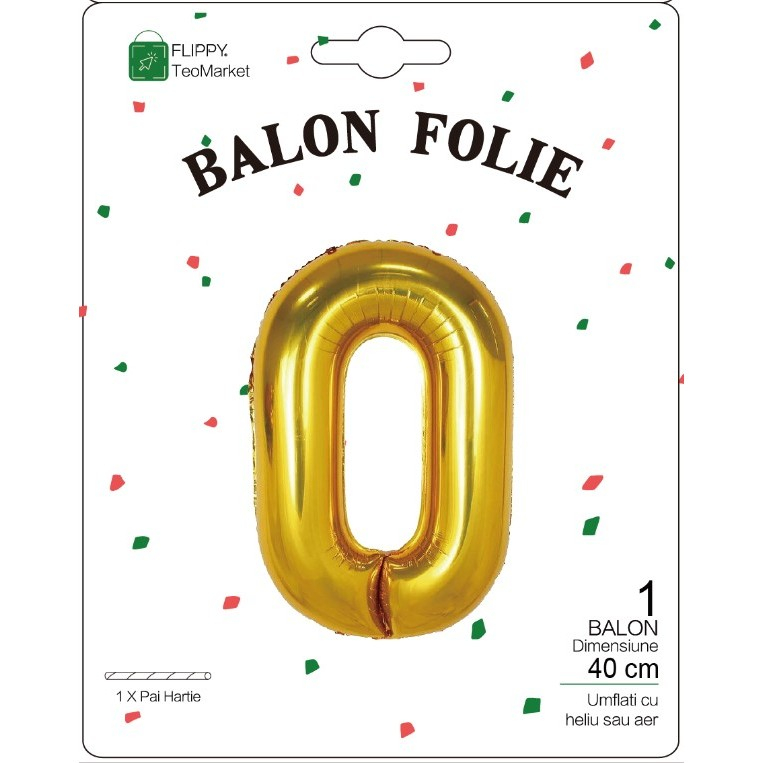 Balon din Folie Metalizata , Figurina Cifra, Tema Aniversare 40 cm, Ambalaj Individual, Pai inclus, Umflare cu Aer sau Heliu, Auriu, Cifra 0