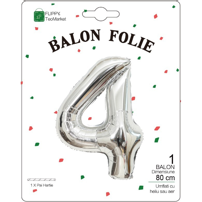 Balon din Folie Metalizata, , Figurina Cifra, Tema Aniversare 80 cm, Ambalaj Individual, Pai inclus, Umflare cu Aer sau Heliu, Argintiu, Cifra 4