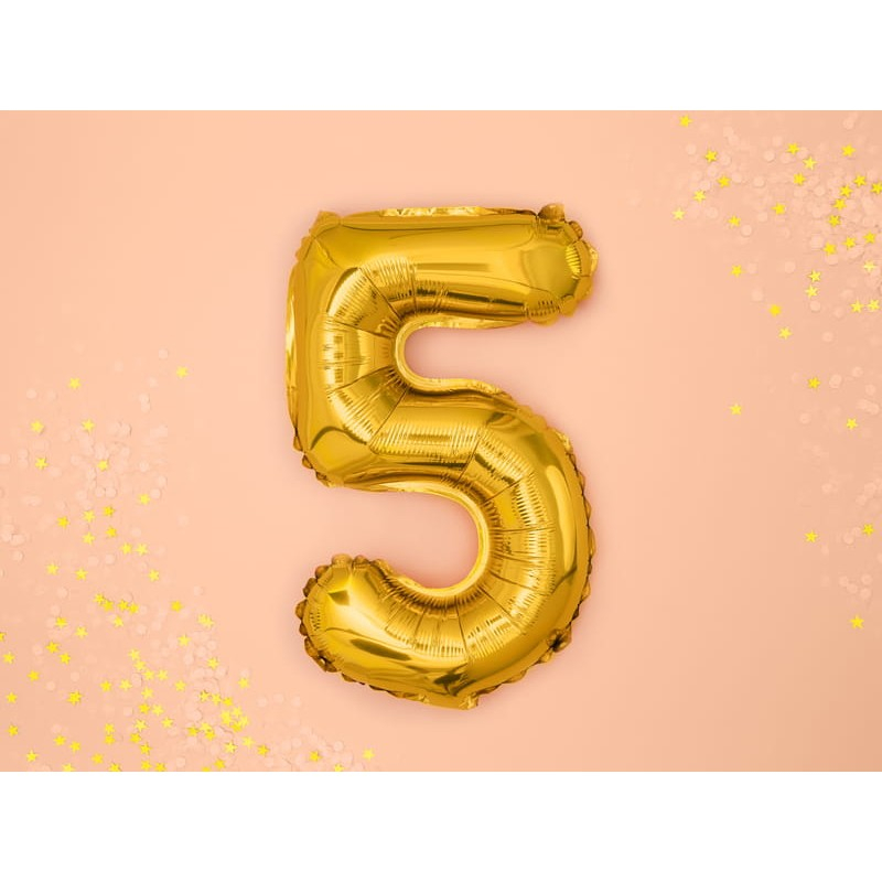 Balon din Folie Metalizata , Figurina Cifra, Tema Aniversare 80 cm, Ambalaj Individual, Pai inclus, Umflare cu Aer sau Heliu, Auriu, Cifra 5