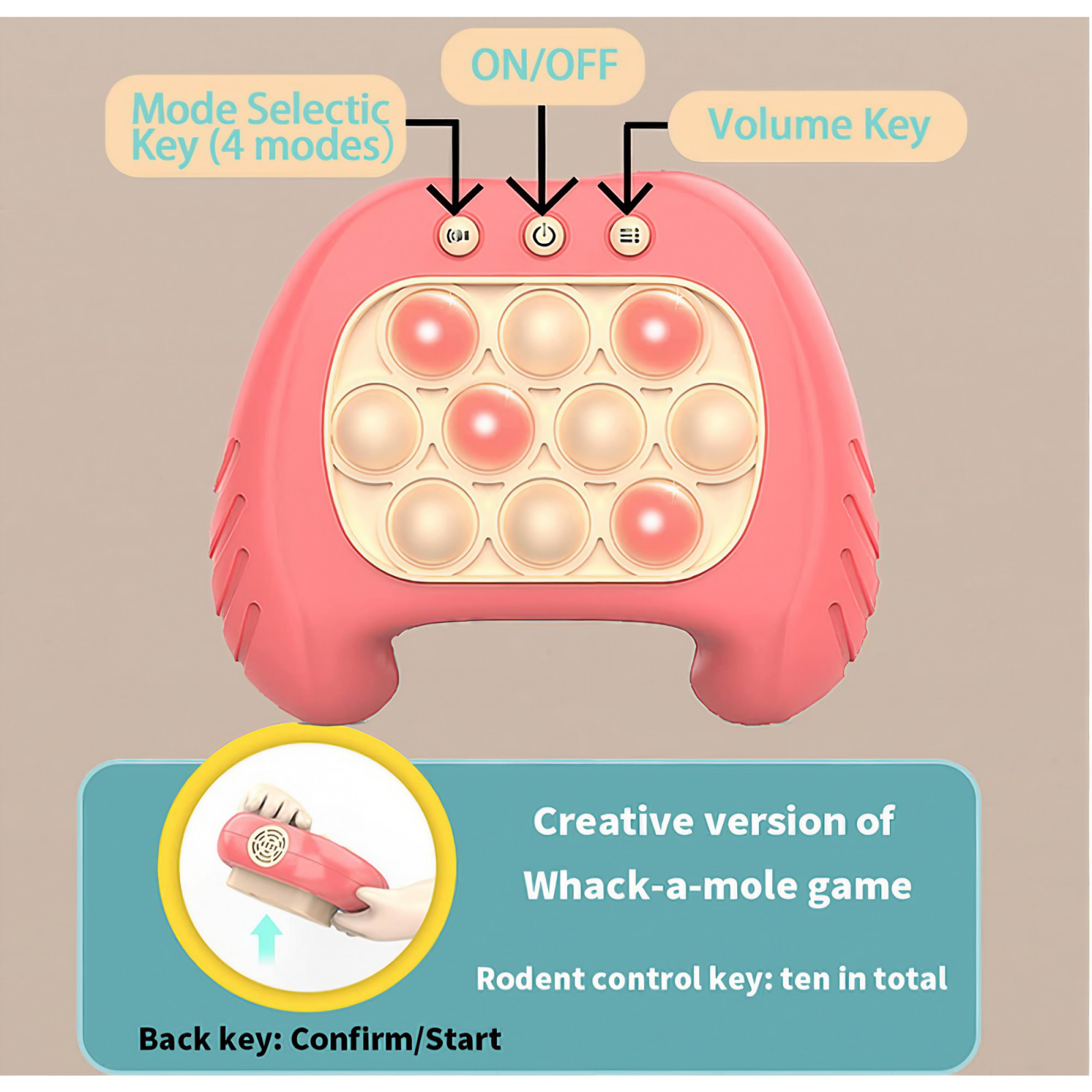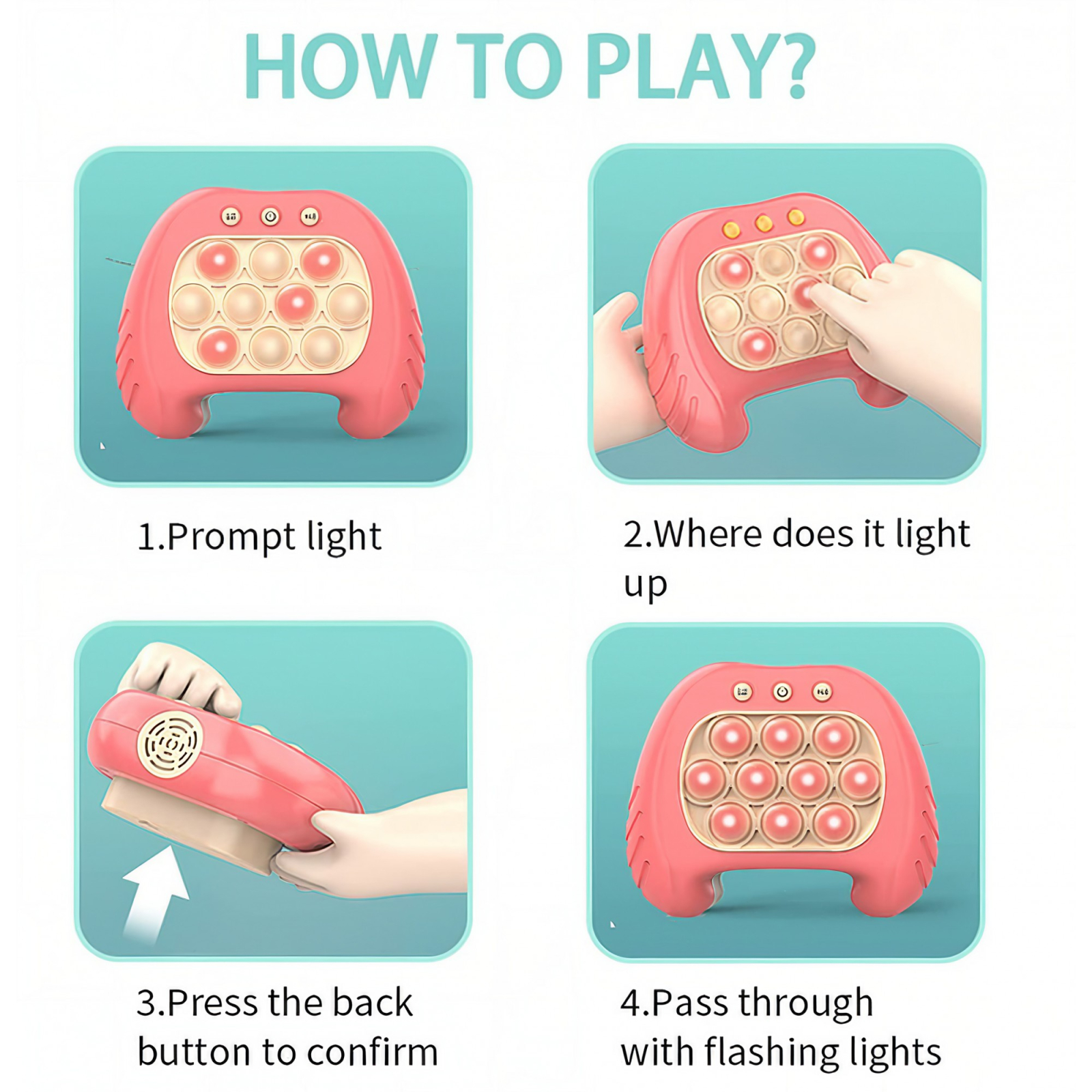 Patru moduri distractive de joc - Apasati rapid si corect bulele aprinse aleatoriu pentru a trece fiecare nivel, daca apasati gresit jocul se va termina. Fiecare mod are diferite feluri de dificultate, ajuta la exersarea vitezei de reactie si a memoriei copiilor, dar si competitie si cooperare prin modul scor si multiplayer.