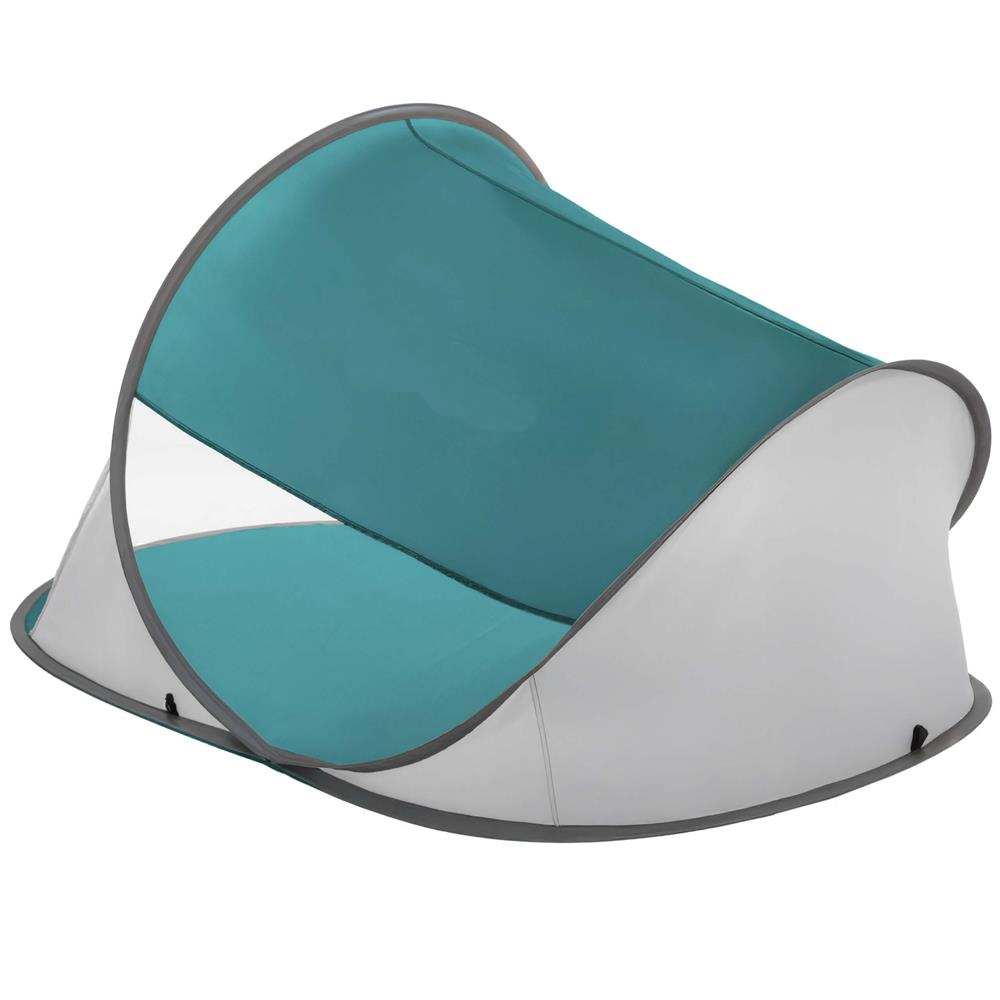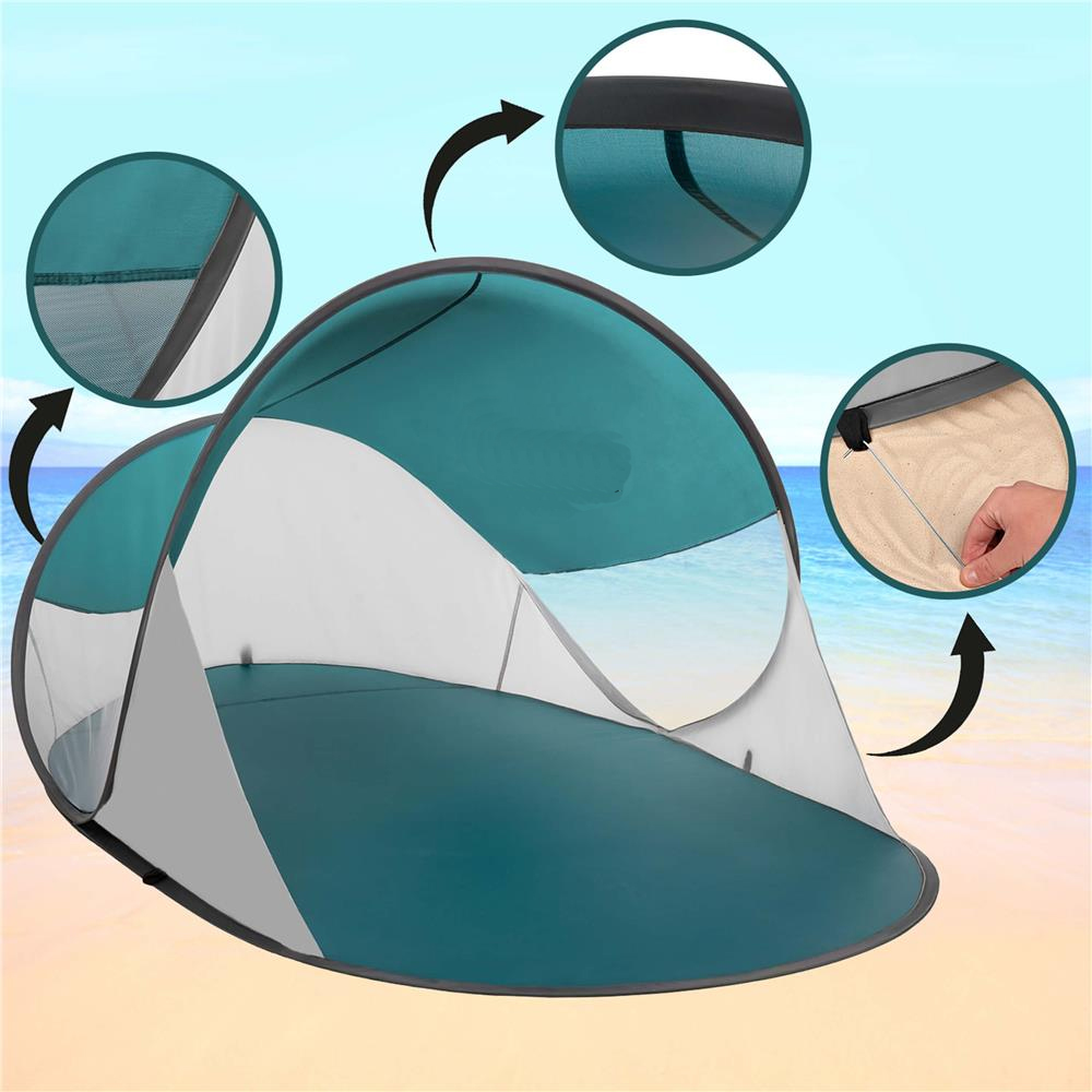 Cort plaja autoexpansibil POP-UP cu protectie UV, podea izolanta si husa transport, 190x120x100 cm, turcoaz si gri
