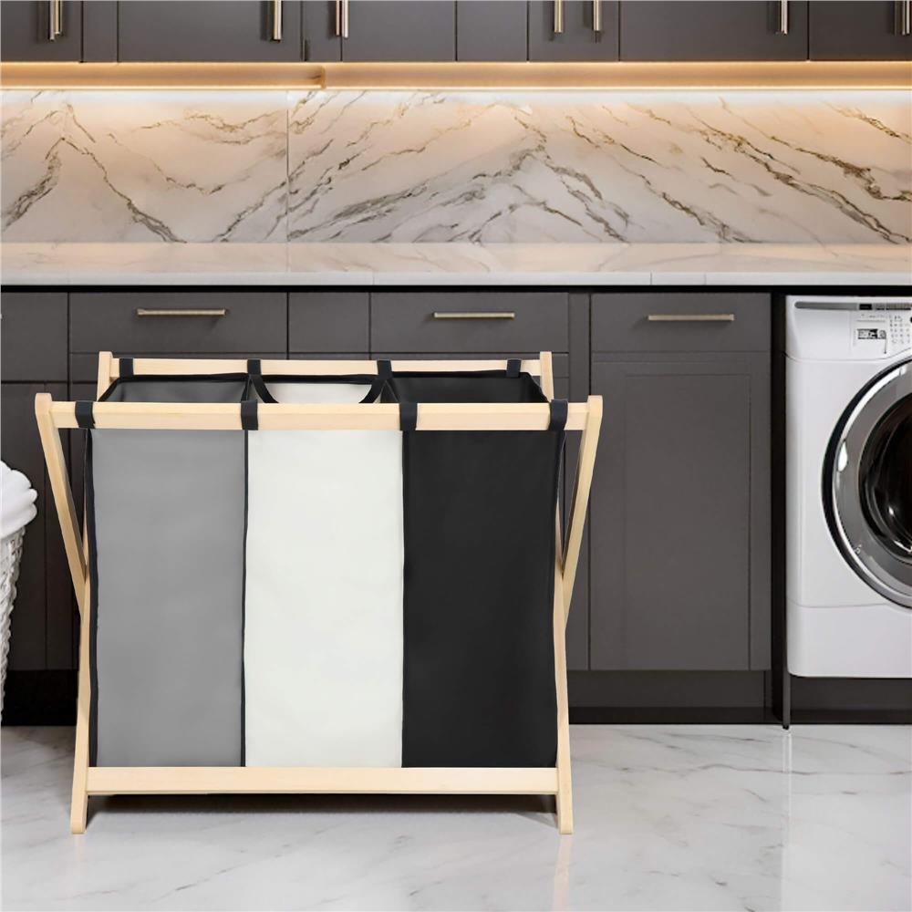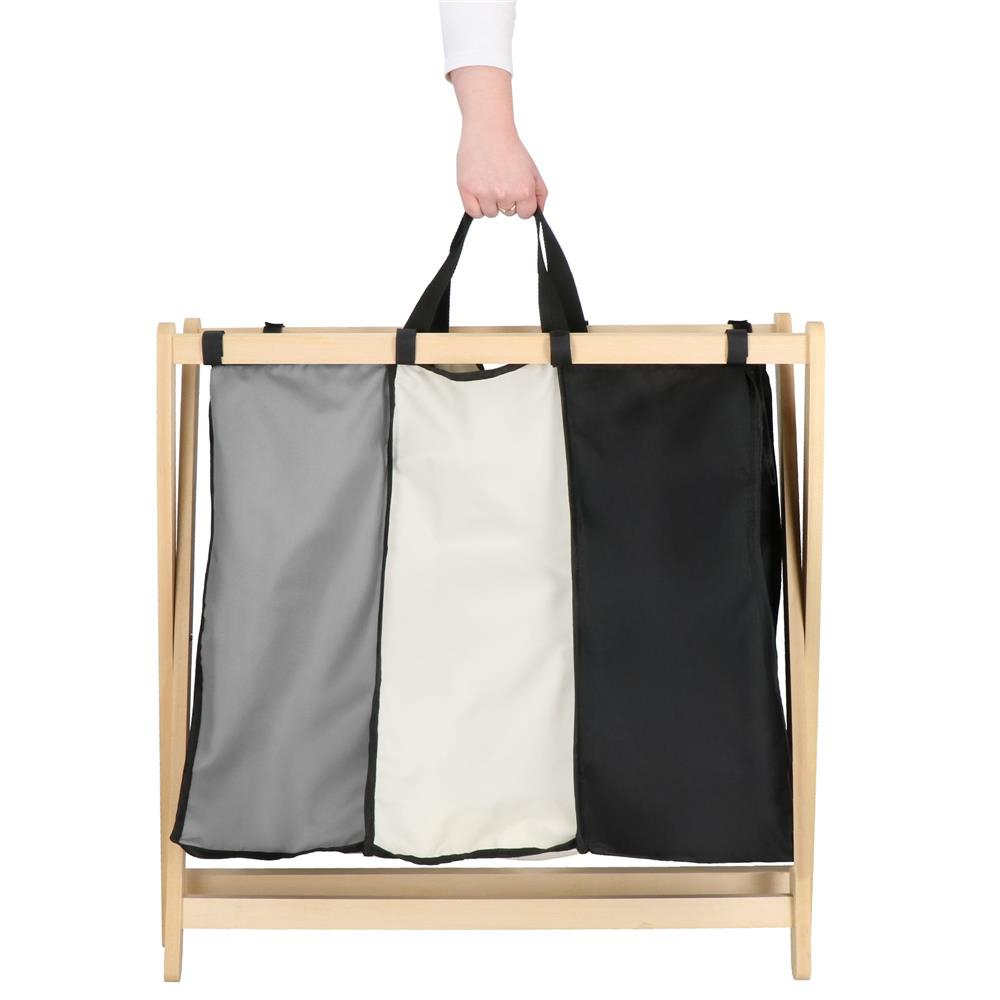 Cos de rufe cu 3 compartimente, cadru din lemn, 67x42x57 cm, 105 litri
