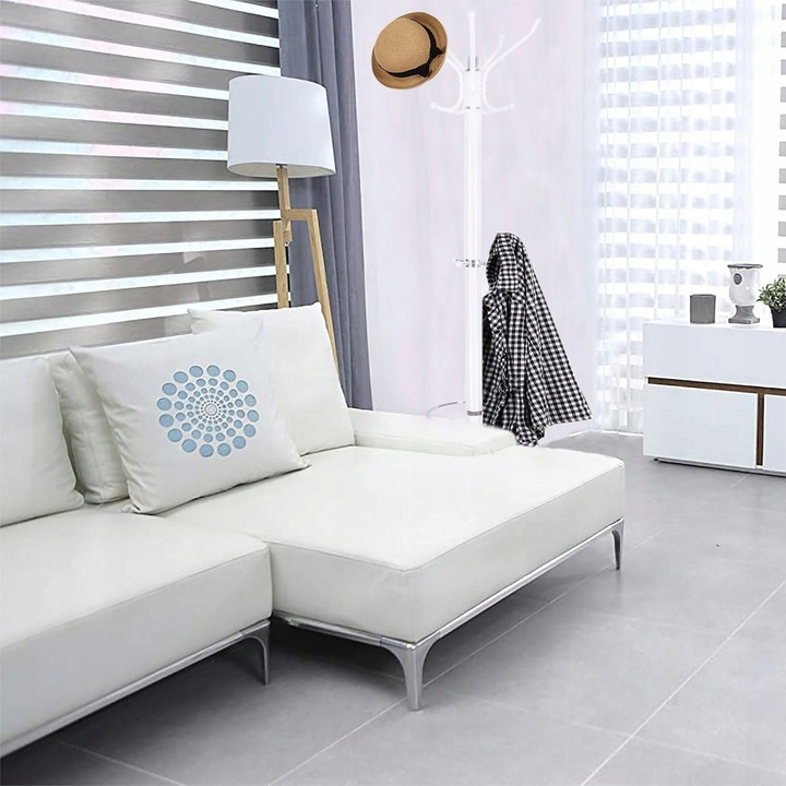 Cuier tip pom din metal cu baza de marmura, 14 agatatoare, 176cm, alb
