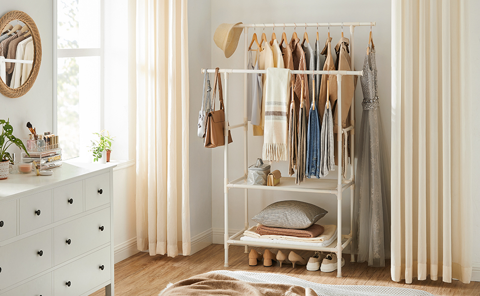 SONGMICS Raft de haine cu bara dubla pentru umerase, 2 polite, incarcare 70 kg, 114x45x171cm, alb