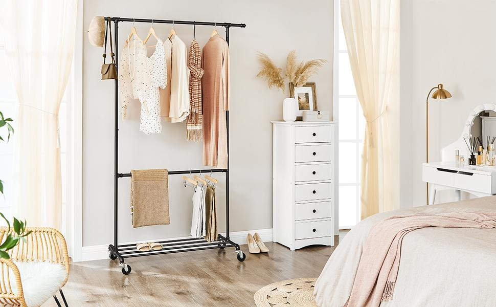 SONGMICS Suport pentru haine, cu raft si 2 sine de agatat, cadru metalic, cu roti, 130x49x198cm, industrial, negru