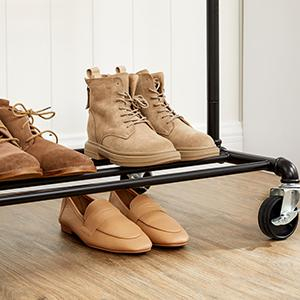 Specificatii: Culoare: Negru Material: Tub de otel acoperit cu pulbere Dimensiune produs: 130 x 49 x 198 cm (L x l x H) Greutate produs: 7,4 kg Max. Capacitate de incarcare: 110 kg Despre acest articol Stil industrial sic:  Indiferent daca aveti un apartament rustic rece sau o casa feminina, acest suport de haine la moda de inspiratie industriala va fi o piesa de exceptie, afisand, de asemenea, imbracamintea elegant in buticuri sau pietele secundare. Stable si puternice: Tuburile metalice premium asigura stabilitate si rezistenta superioara cu o capacitate totala de greutate de 110 kg; pentru a-ti agata cele mai grele jachete de iarna sau rochii sic de cocktail, acest suport de imbracaminte este un must-have. Reglabil si spatios: Reglati sina din mijloc intre 4 inaltimi diferite (in timp ce inaltimea totala ramane fixa), agatati paltoanele sau rochiile lungi pe sina de sus si pantofii sau gentile gata pe raftul de jos - acest suport pastreaza totul intr-un singur loc. Usor de mutat sau de sedere: 4 roti universale din PP cu 2 frane de blocare asigura ca suportul pentru haine poate calatori fara probleme dintr-o locatie in alta si ramane pe loc. Asamblarea este usoara: Cu instrumente de asamblare, piese numerotate si instructiuni ilustrate, puteti configura cu usurinta aceasta sina pentru haine.